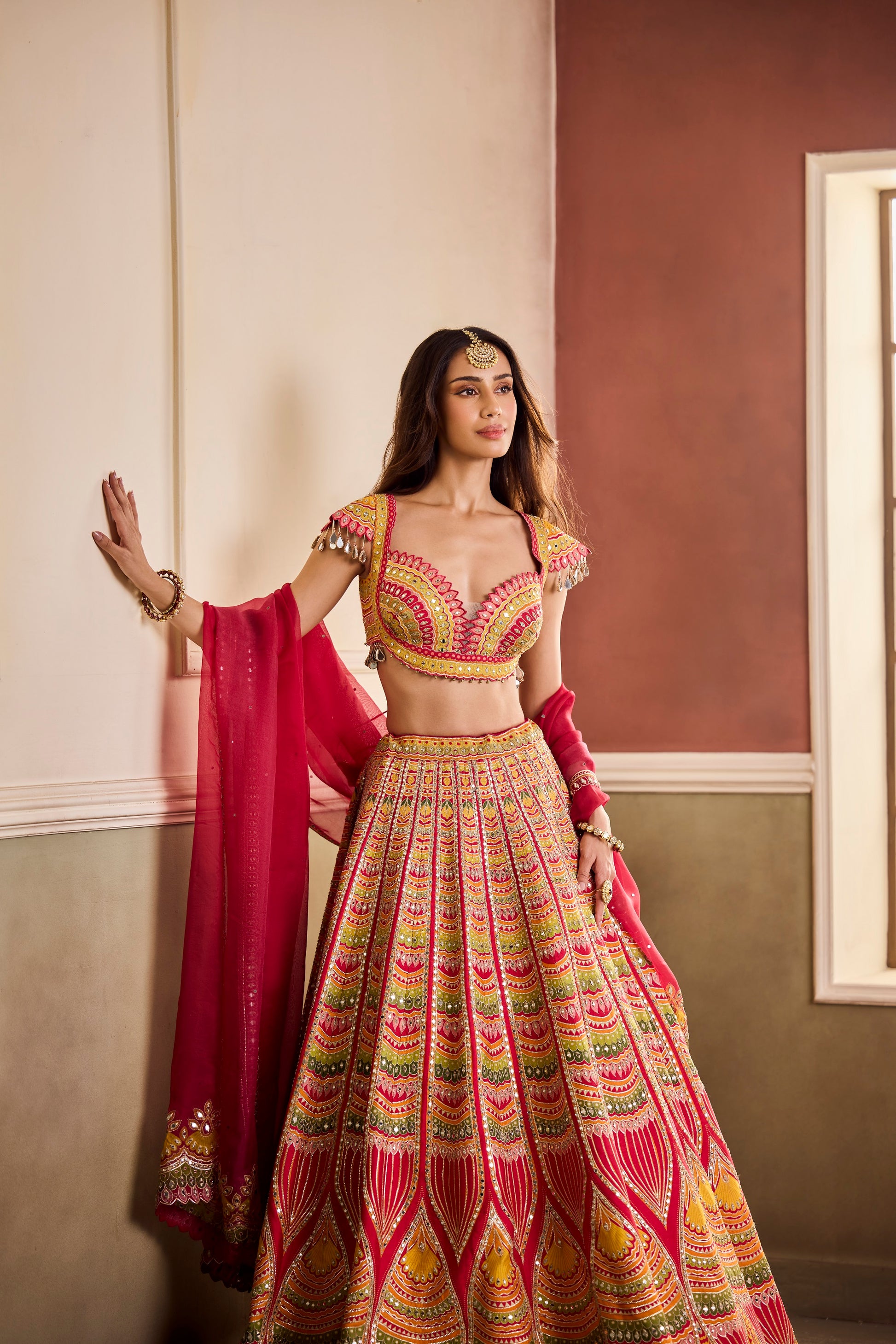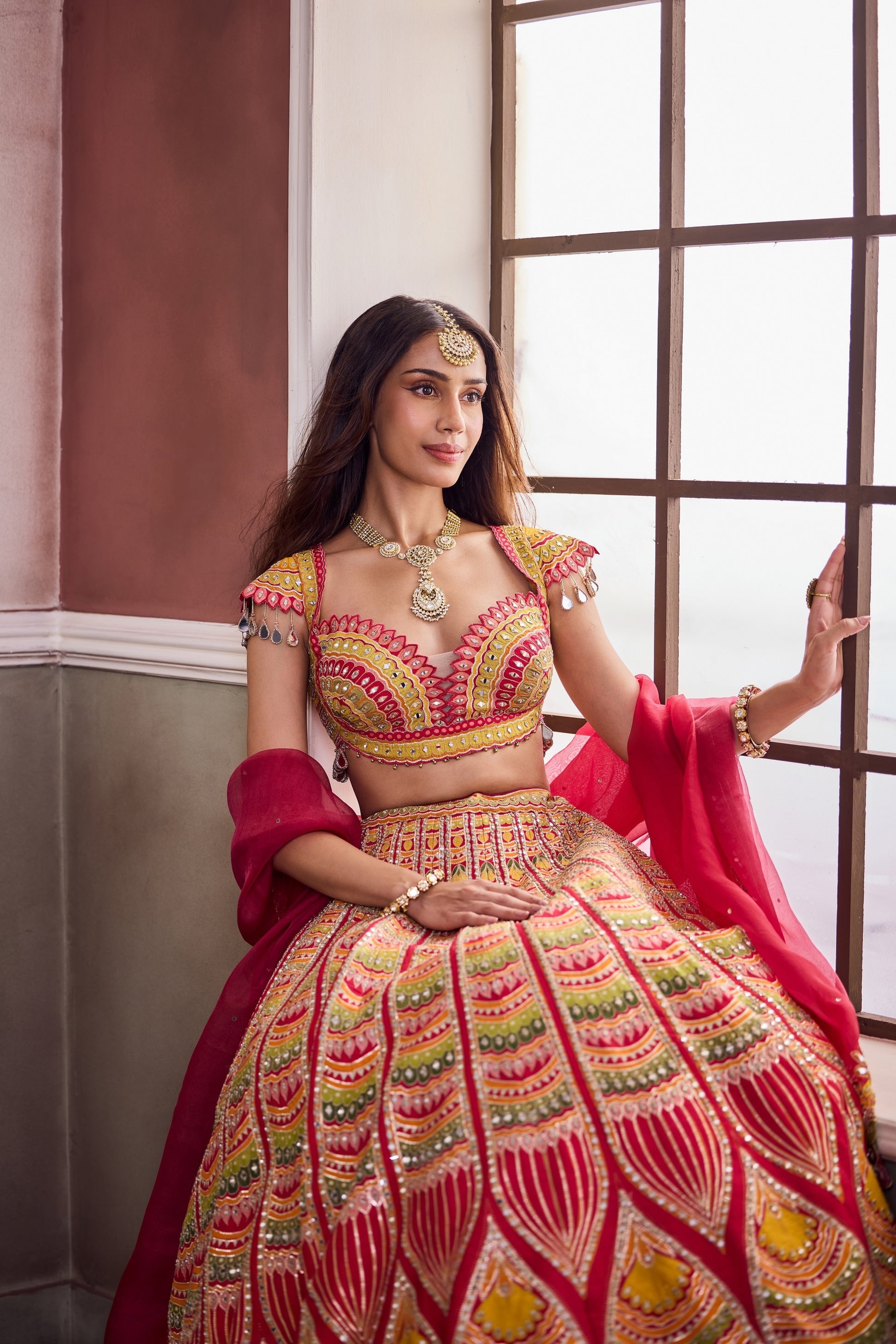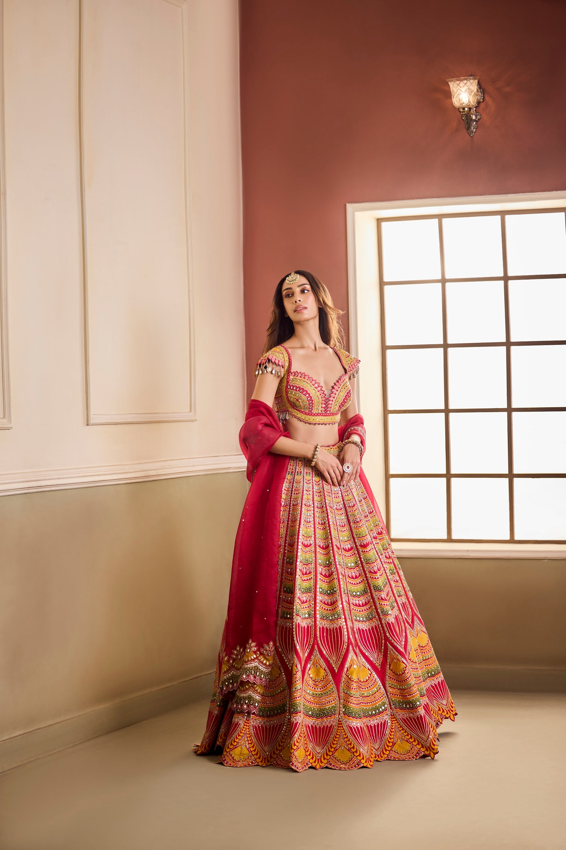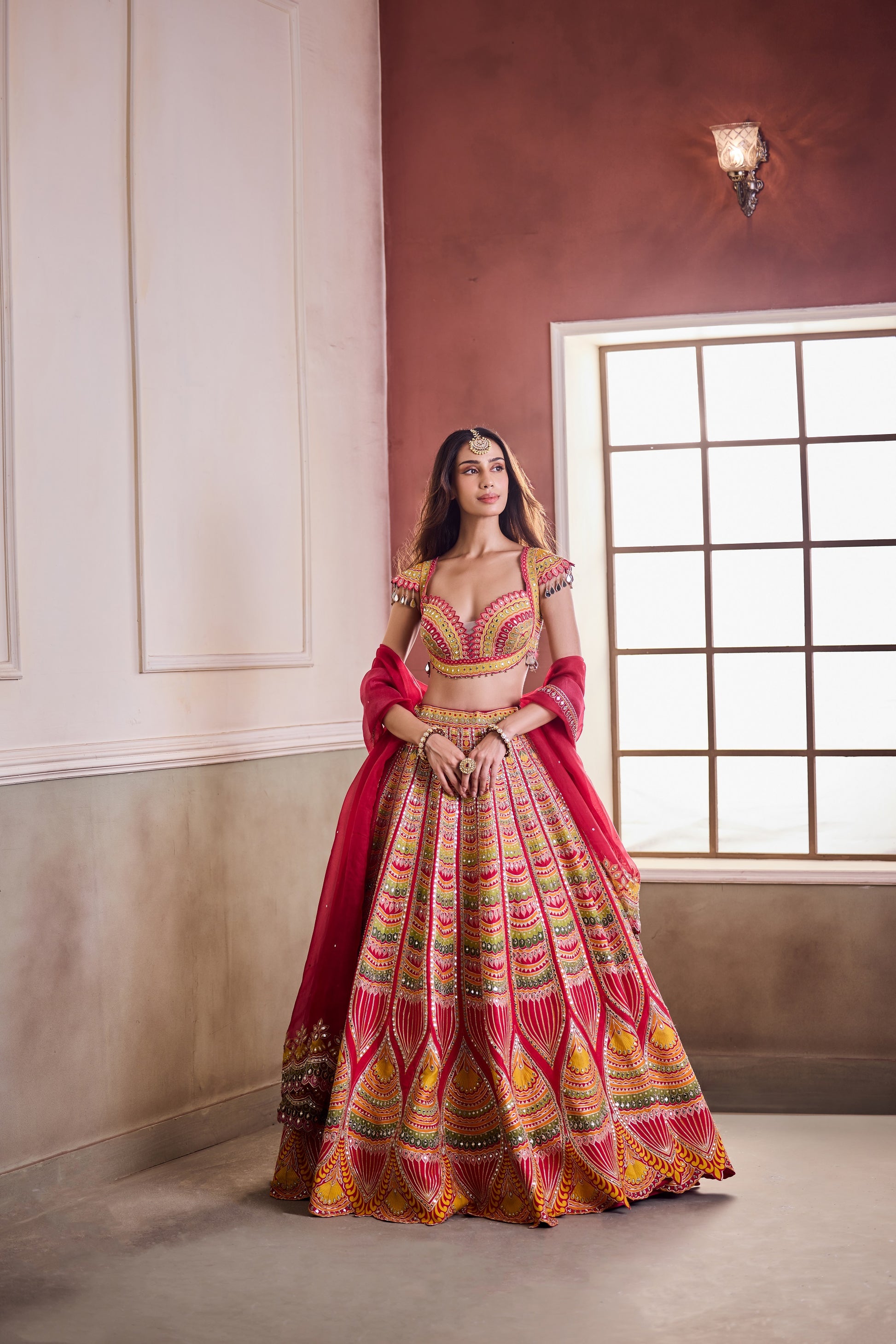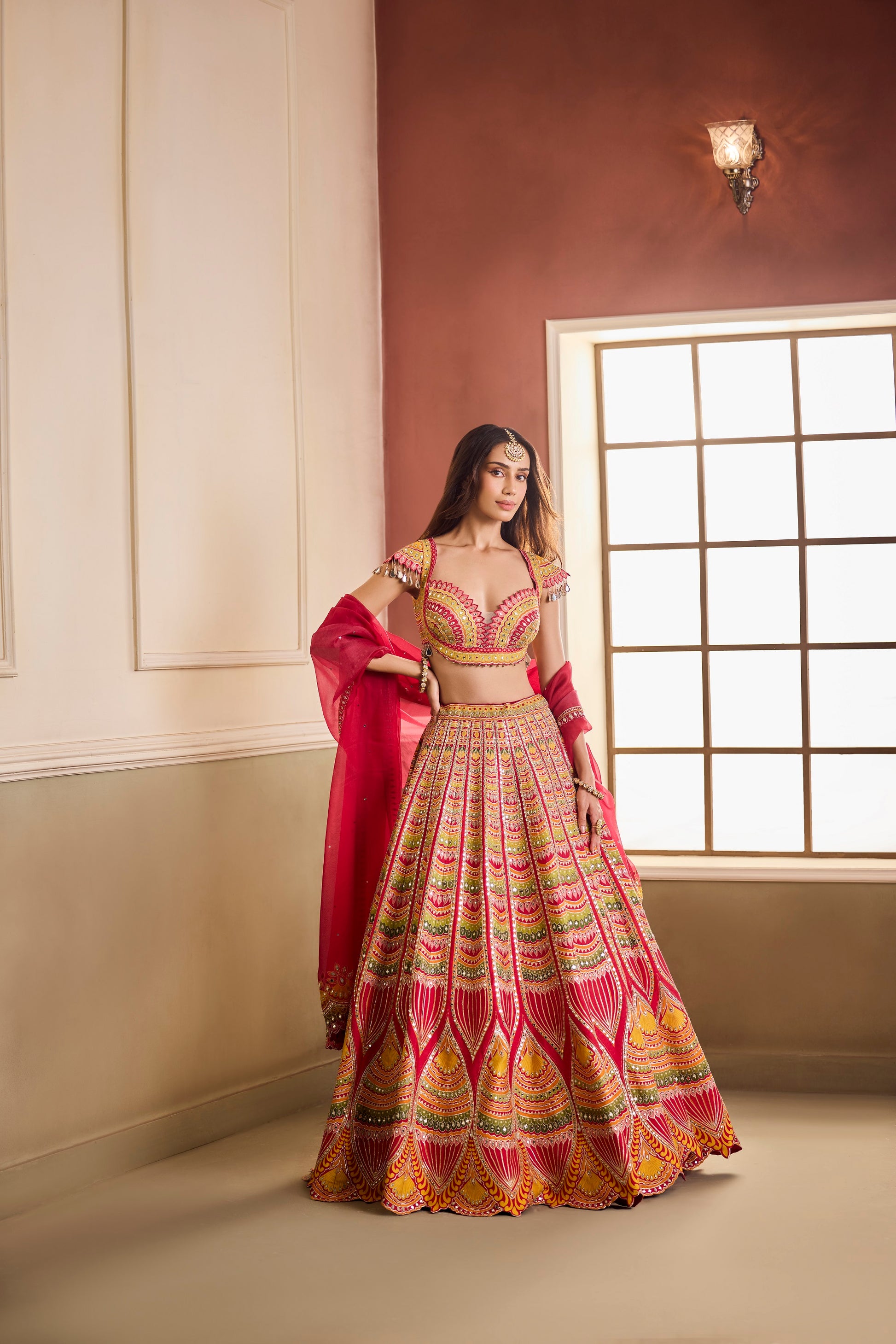 Vivid and commanding, this Vaaha masterpiece celebrates colour in its most regal form. The lehenga unfurls in shades of red, saffron, and fuchsia — embroidered in architectural motifs reminiscent of temple spires and festivity. Mirror work and fine gota accents illuminate the ensemble, balanced by a sheer crimson dupatta.