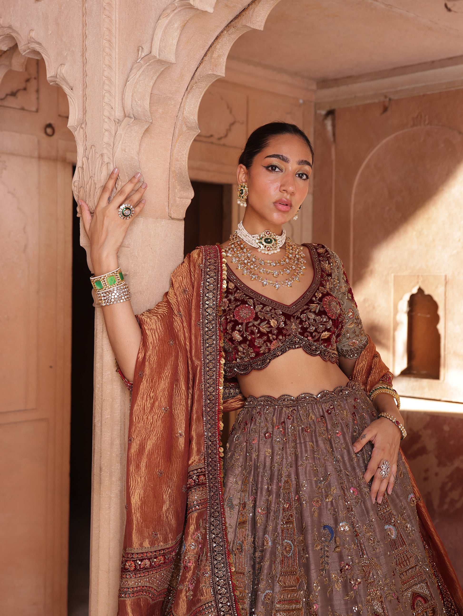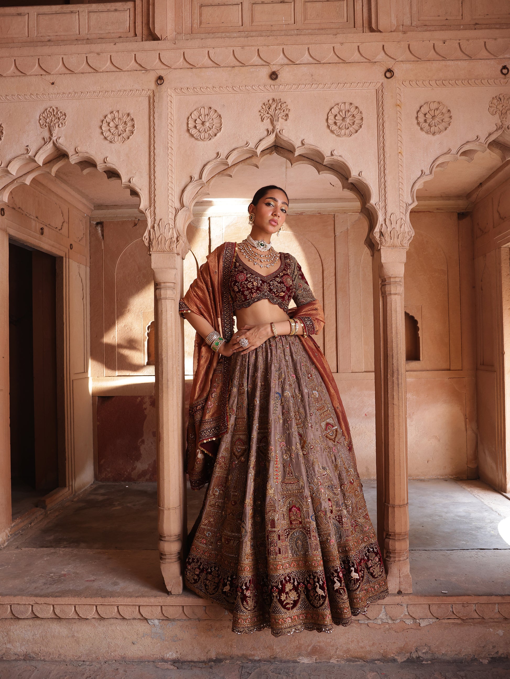 The blouse, intricately encrusted and impeccably tailored, anchors the look with confidence. Finished with a richly bordered dupatta, the ensemble evokes old-world magnificence through a modern couture lens.