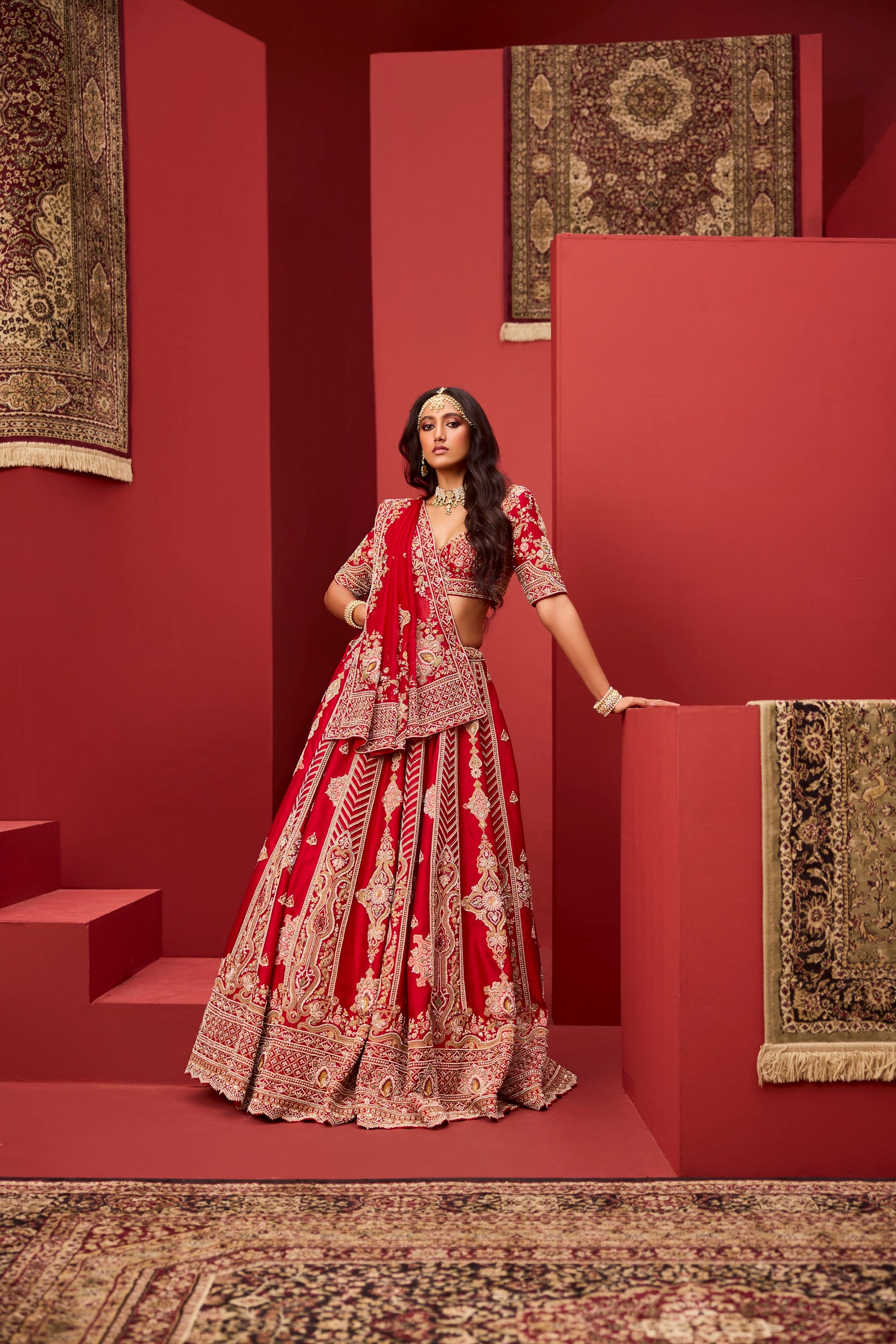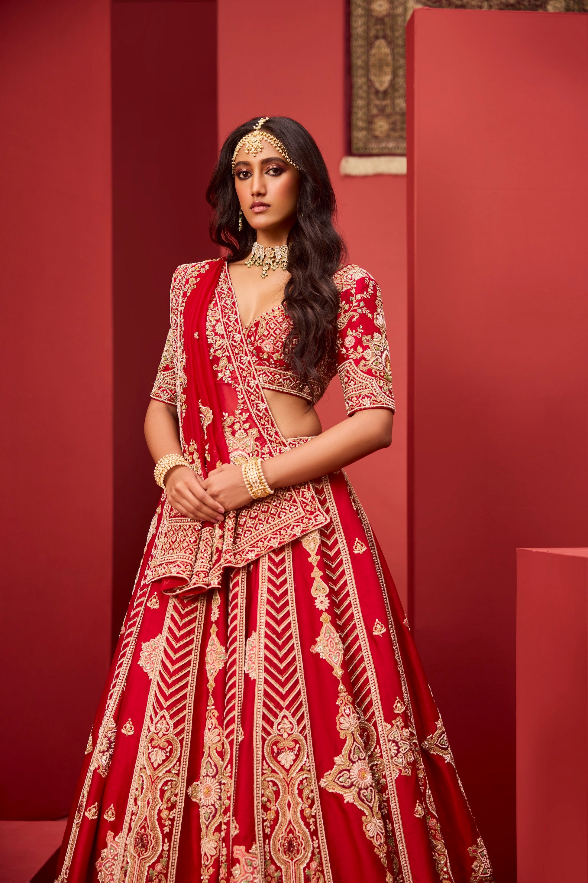 Paired with a finely embellished blouse and veil-style dupatta, this ensemble is rich, symbolic, and unapologetically regal.