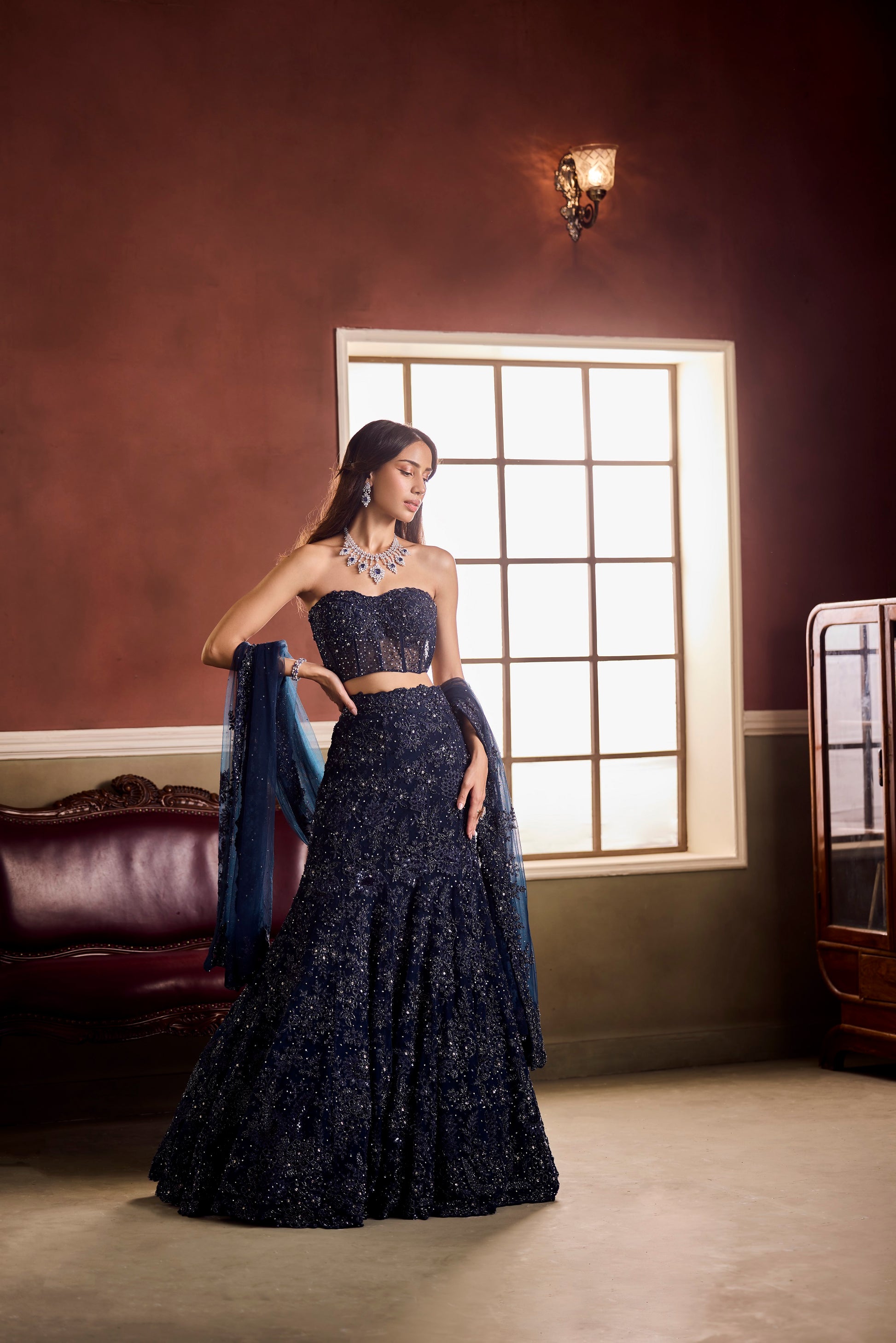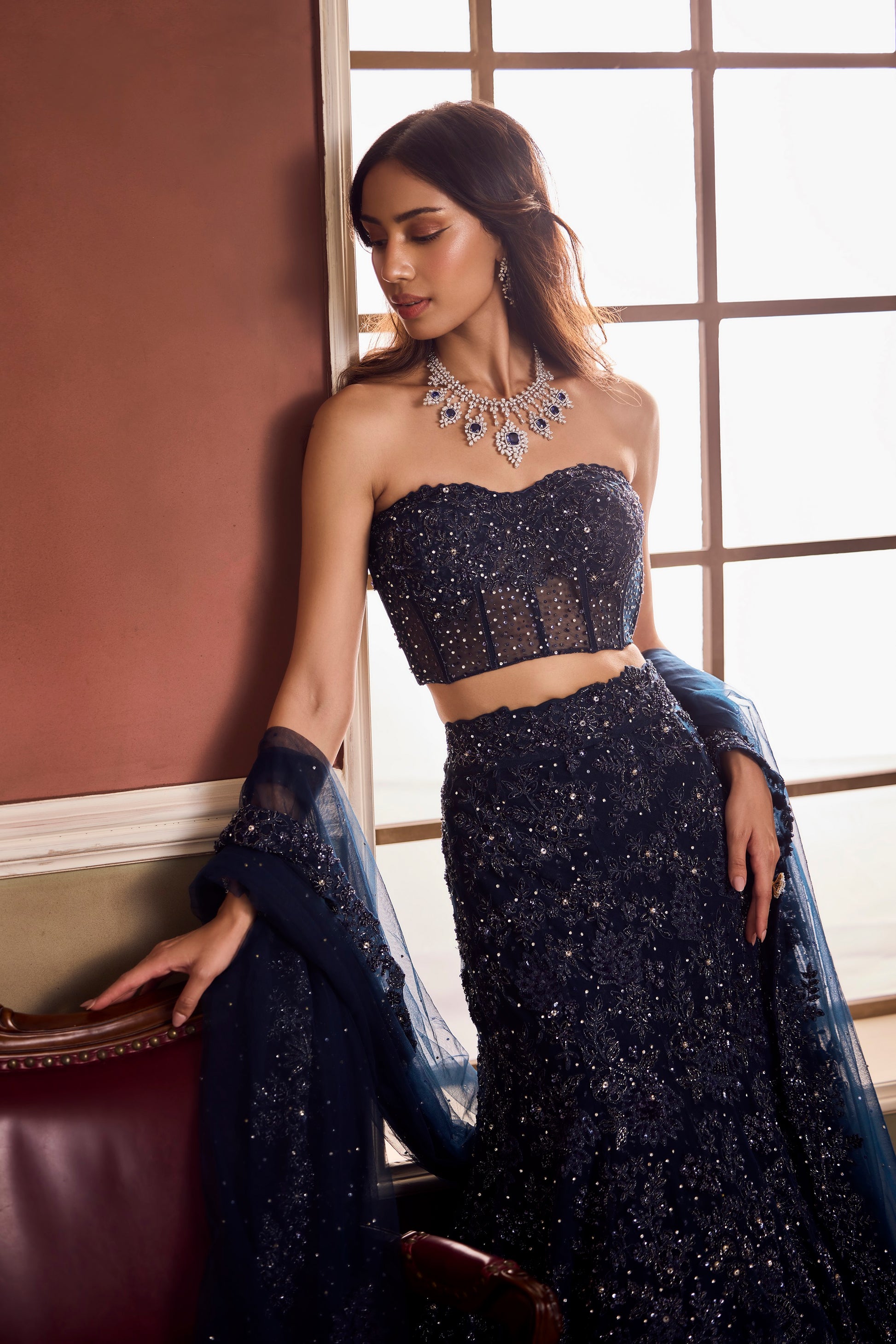 Dark, dazzling, and undeniably elegant — Vaaha’s midnight lehenga is a constellation of sequins and hand-beaded embellishments. The strapless corset blouse and layered skirt are sculpted to perfection, shimmering with every movement. A sheer dupatta completes the celestial silhouette, ethereal yet commanding.