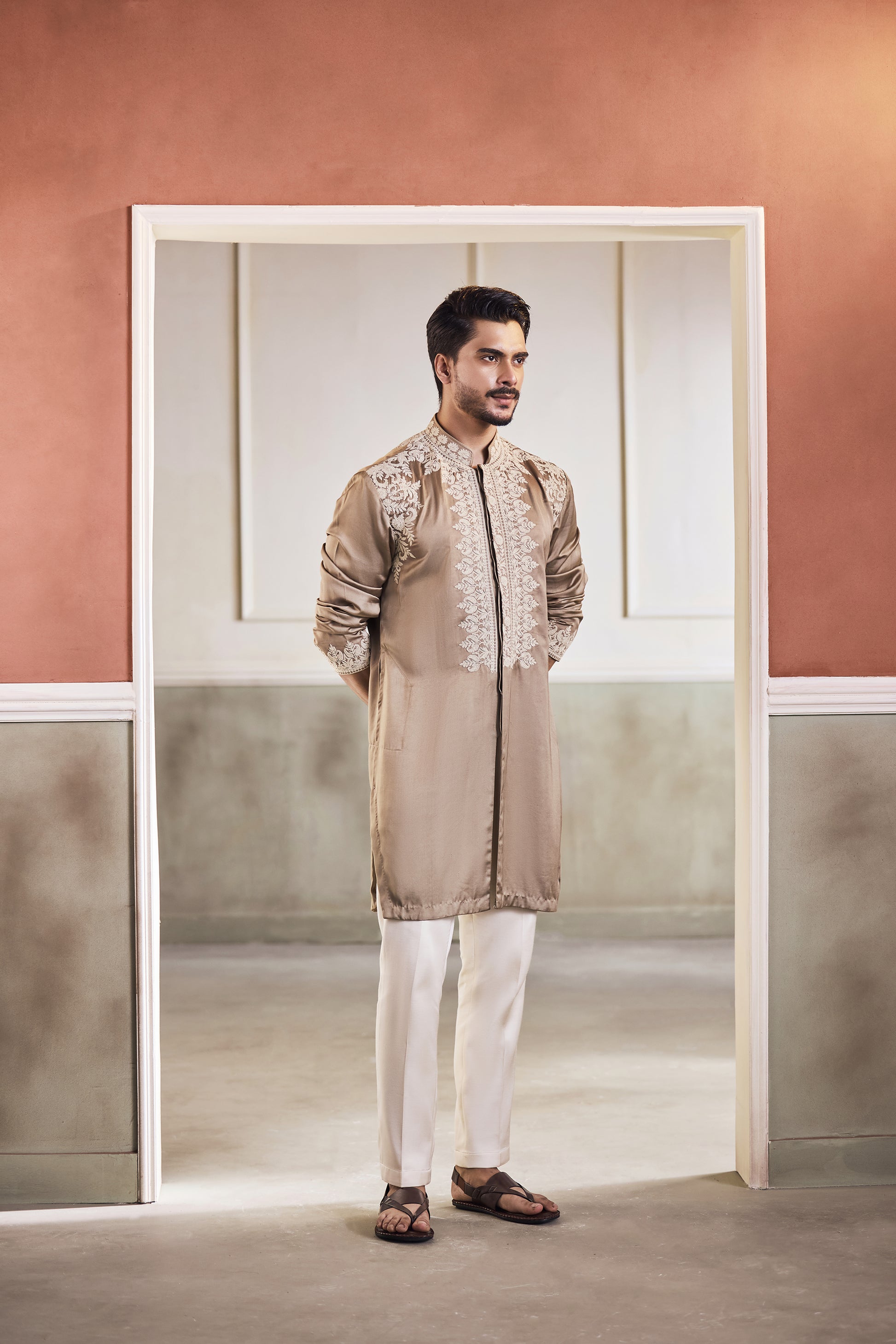 A refined kurta in a muted champagne–sand silk blend, highlighted with tonal resham embroidery that cascades in a vertical panel from the band collar to the hem. Subtle floral motifs on the shoulders and cuffs lend depth without overpowering the natural sheen of the fabric. Paired with classic ivory churidar trousers, this ensemble is an ideal choice for day weddings or elegant evening gatherings.