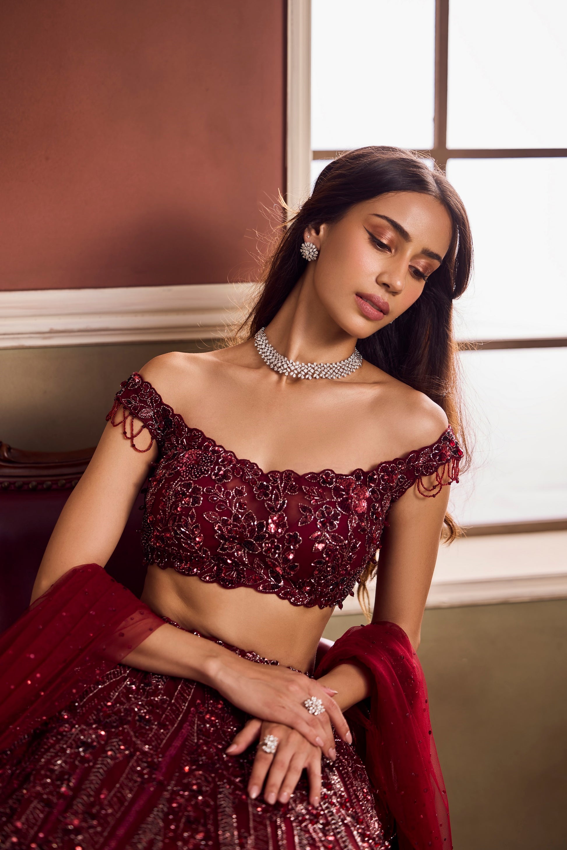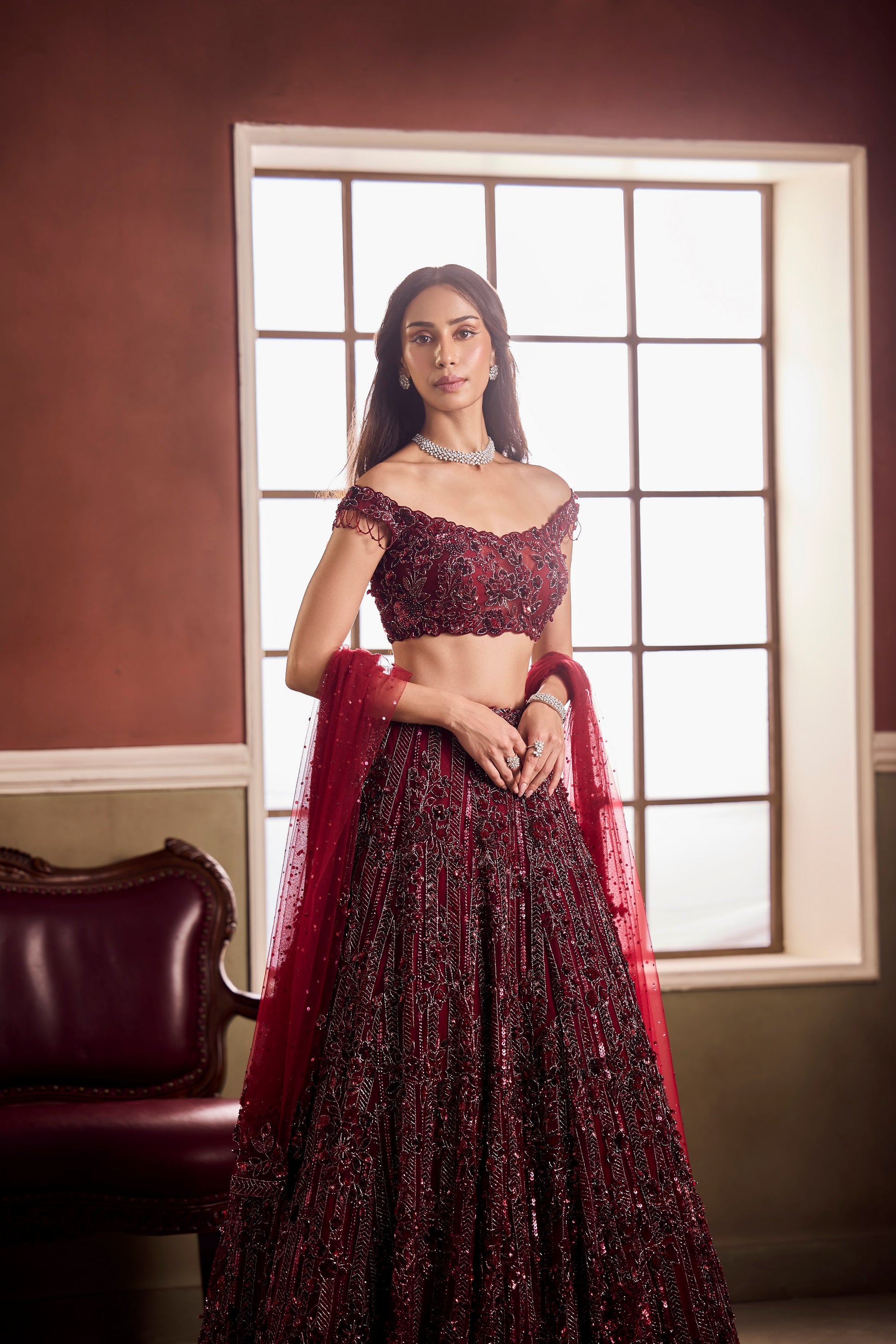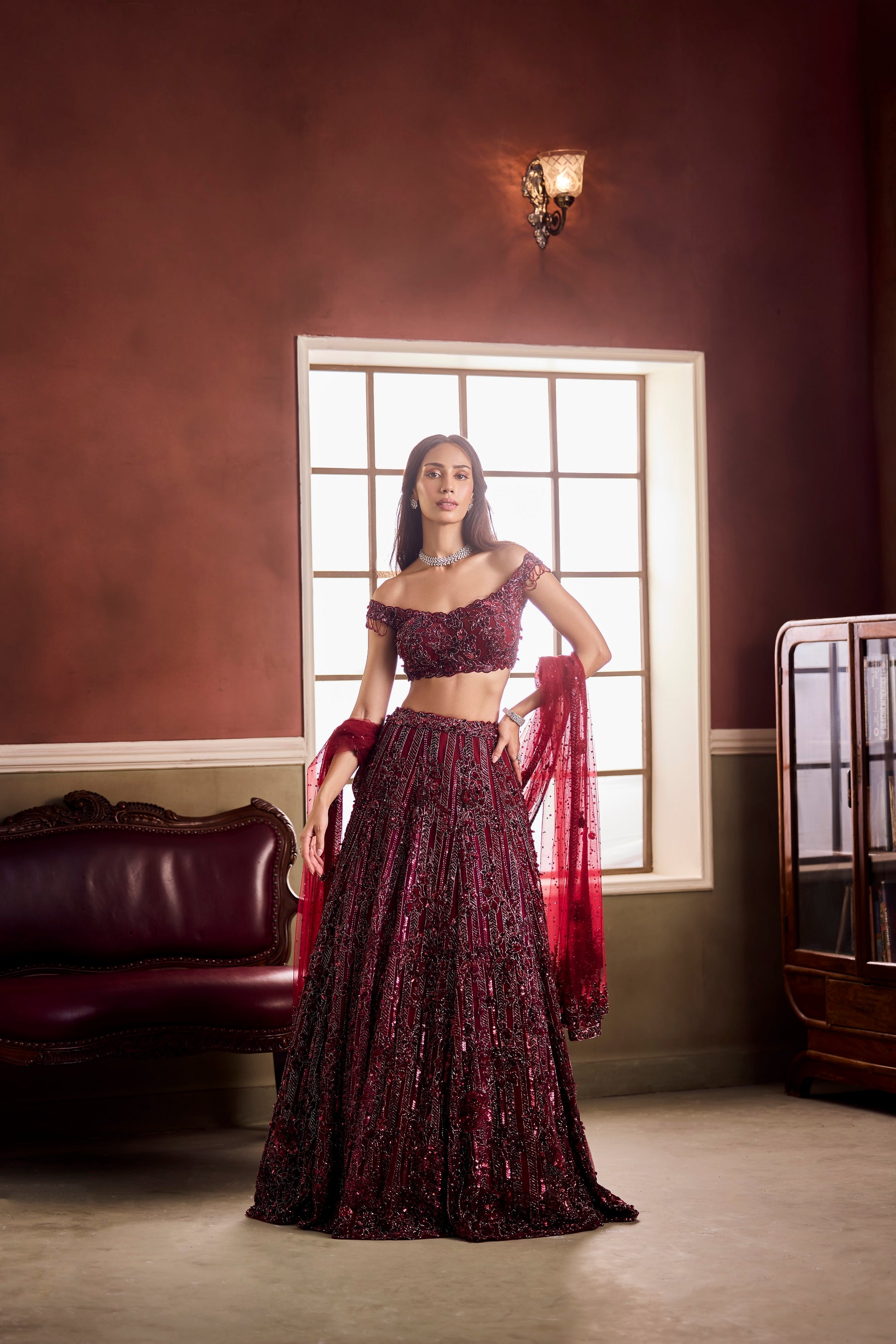 This deep garnet lehenga by Vaaha embodies opulent intensity. Intricate sequin and crystal embroidery runs in linear precision, catching light with every gesture. The off-shoulder blouse and sheer dupatta add a touch of romantic modernity to the richly detailed silhouette.