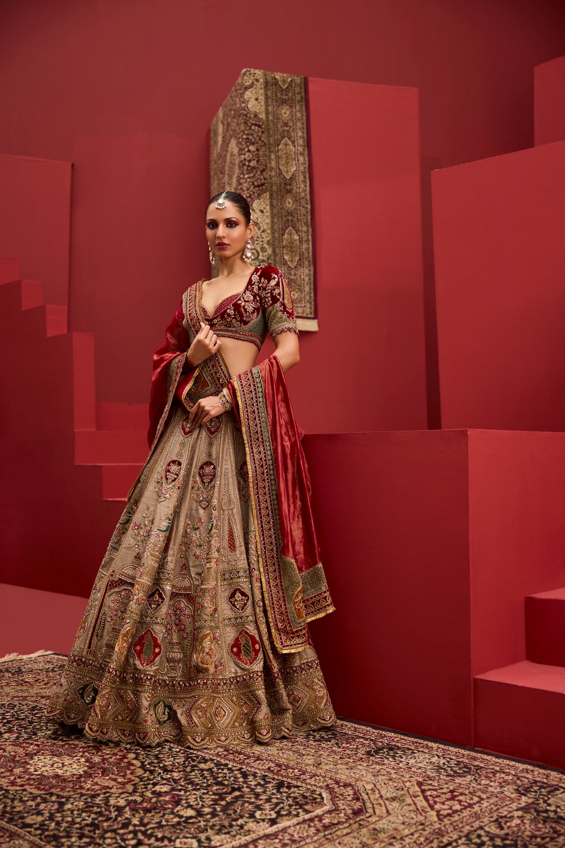 Commanding and timeless, this lehenga is crafted in classic bridal crimson silk, lavishly embroidered with arched palace motifs, florals, and ornate borders in antique gold zari. The lower panels feature architectural storytelling, lending depth and grandeur to the silhouette.
