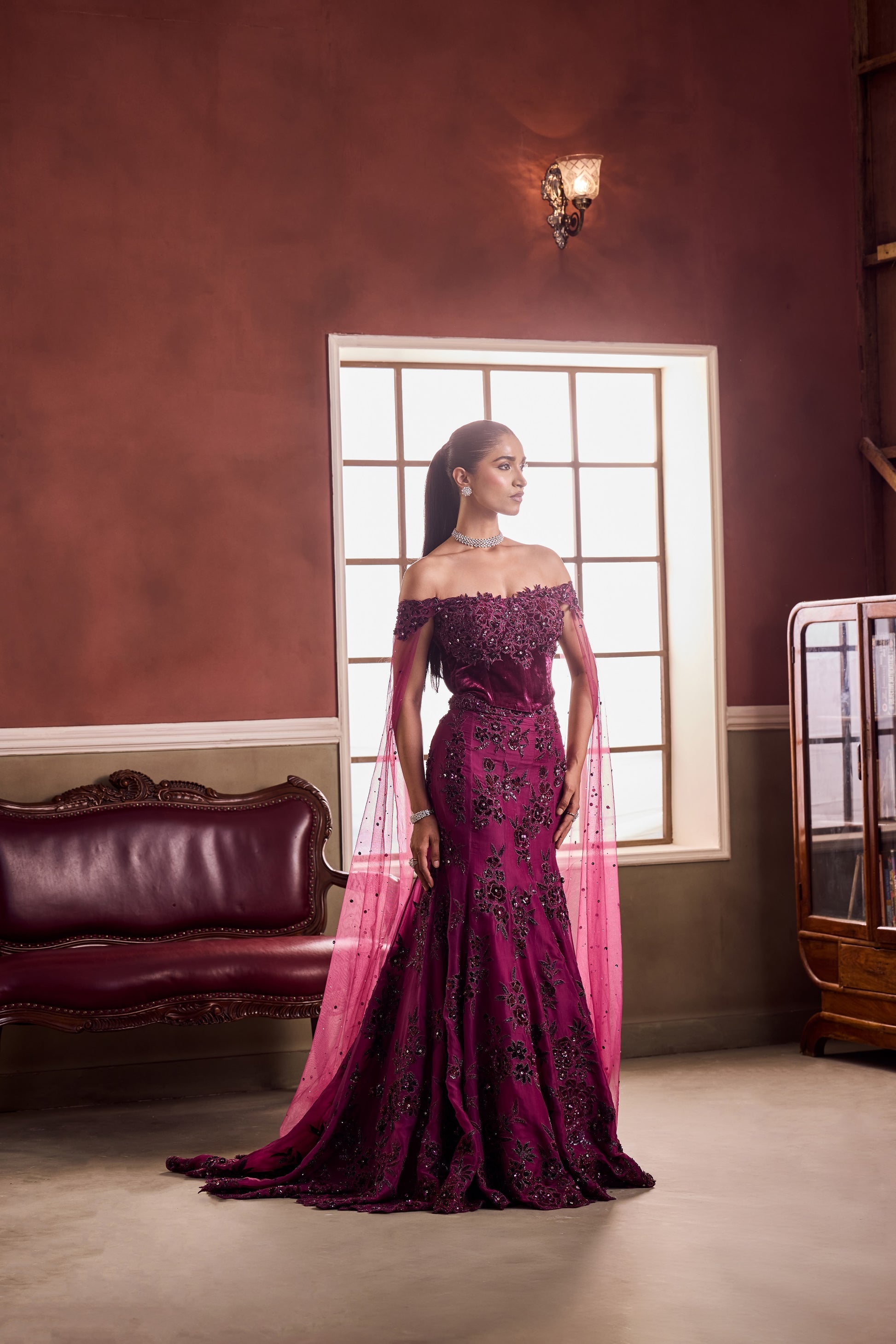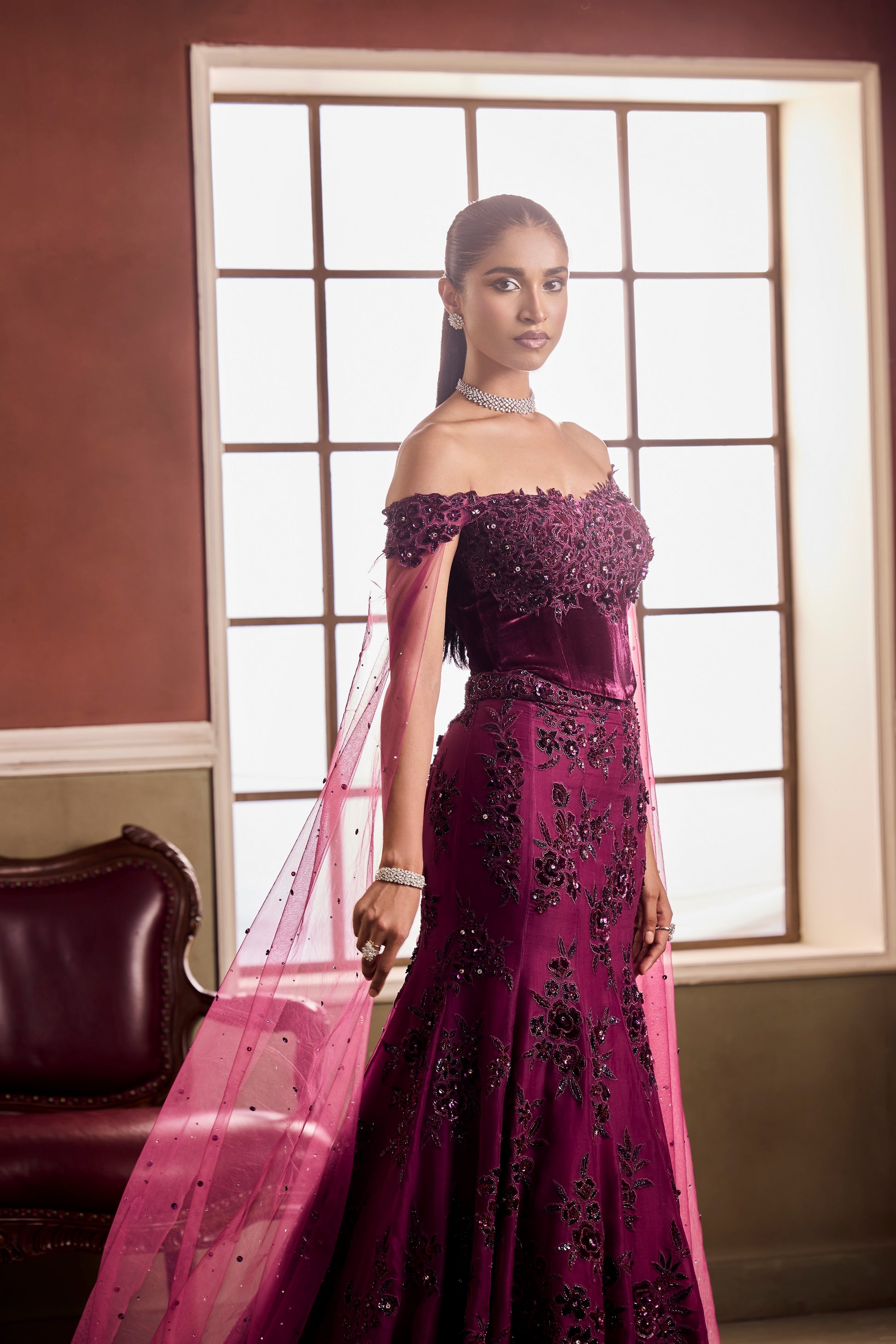 Where sensuality meets sophistication — this Vaaha creation in amethyst velvet is adorned with tonal embroidery and sequins that glisten like moonlight. The off-shoulder neckline and tulle drapes exude old-world glamour, flowing into a mermaid silhouette that sculpts and celebrates the form.