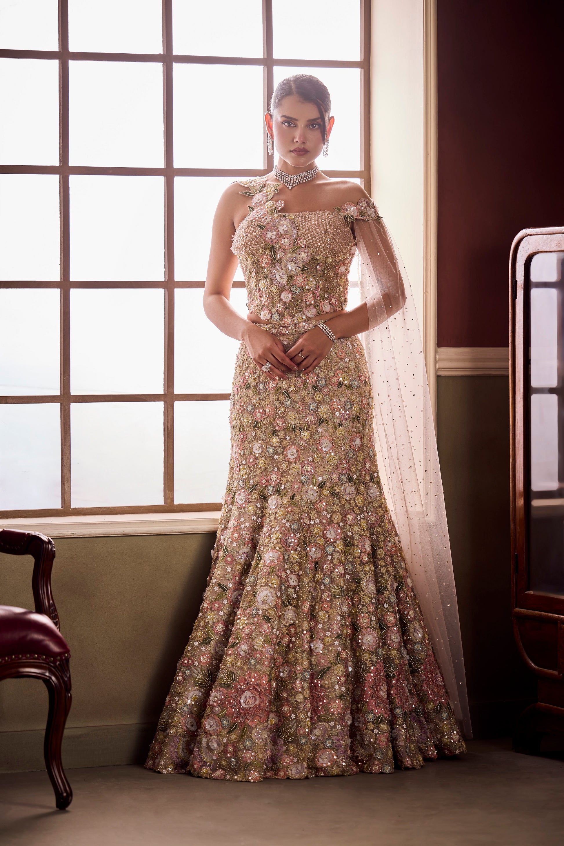 Crafted like a bouquet of light, this blush-toned lehenga from Vaaha sparkles with pearls, sequins, and 3D floral embroidery. The asymmetric bodice blooms with handcrafted appliqué and beaded detailing, cascading into a mermaid skirt that glows with iridescent charm.