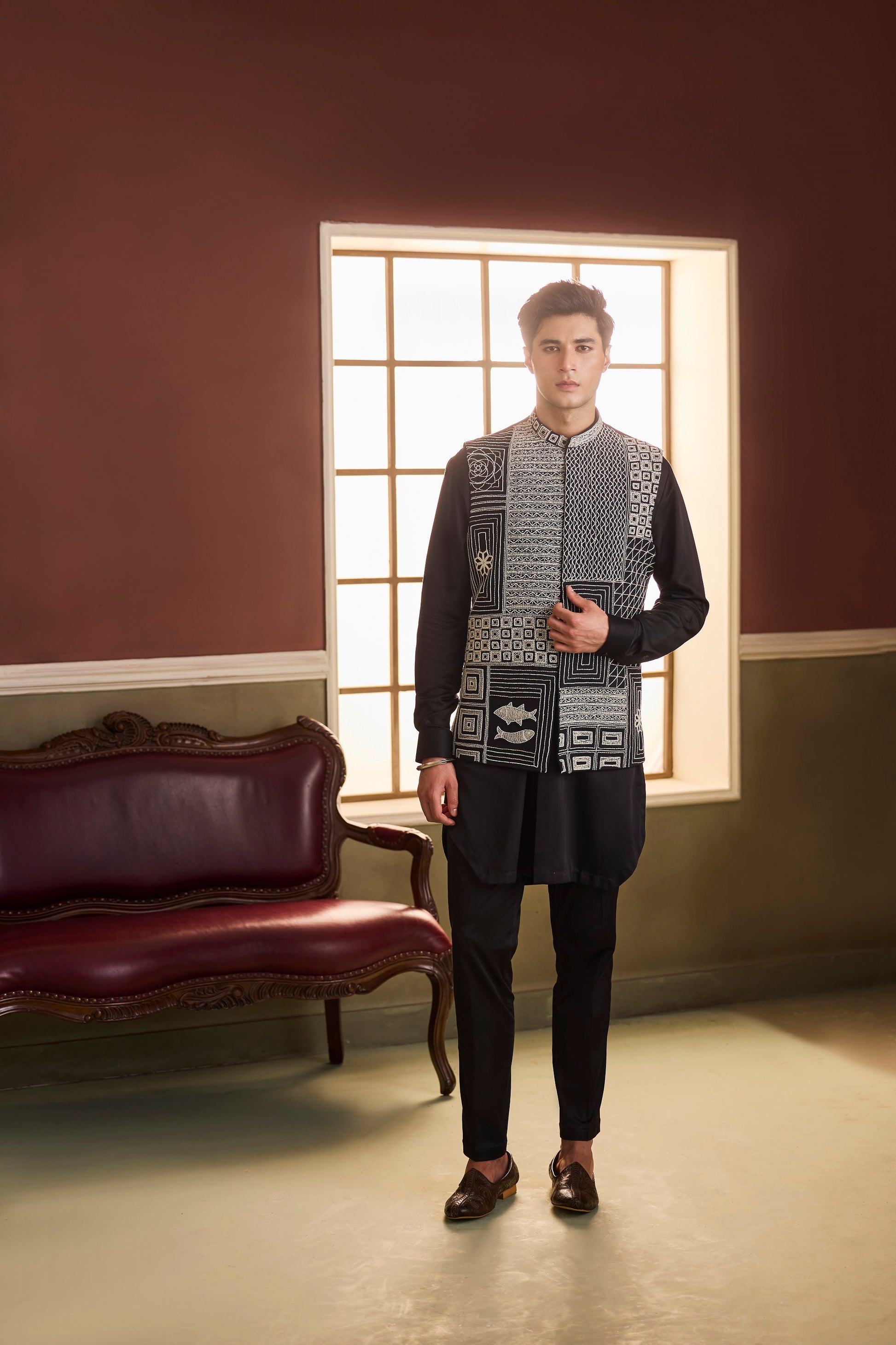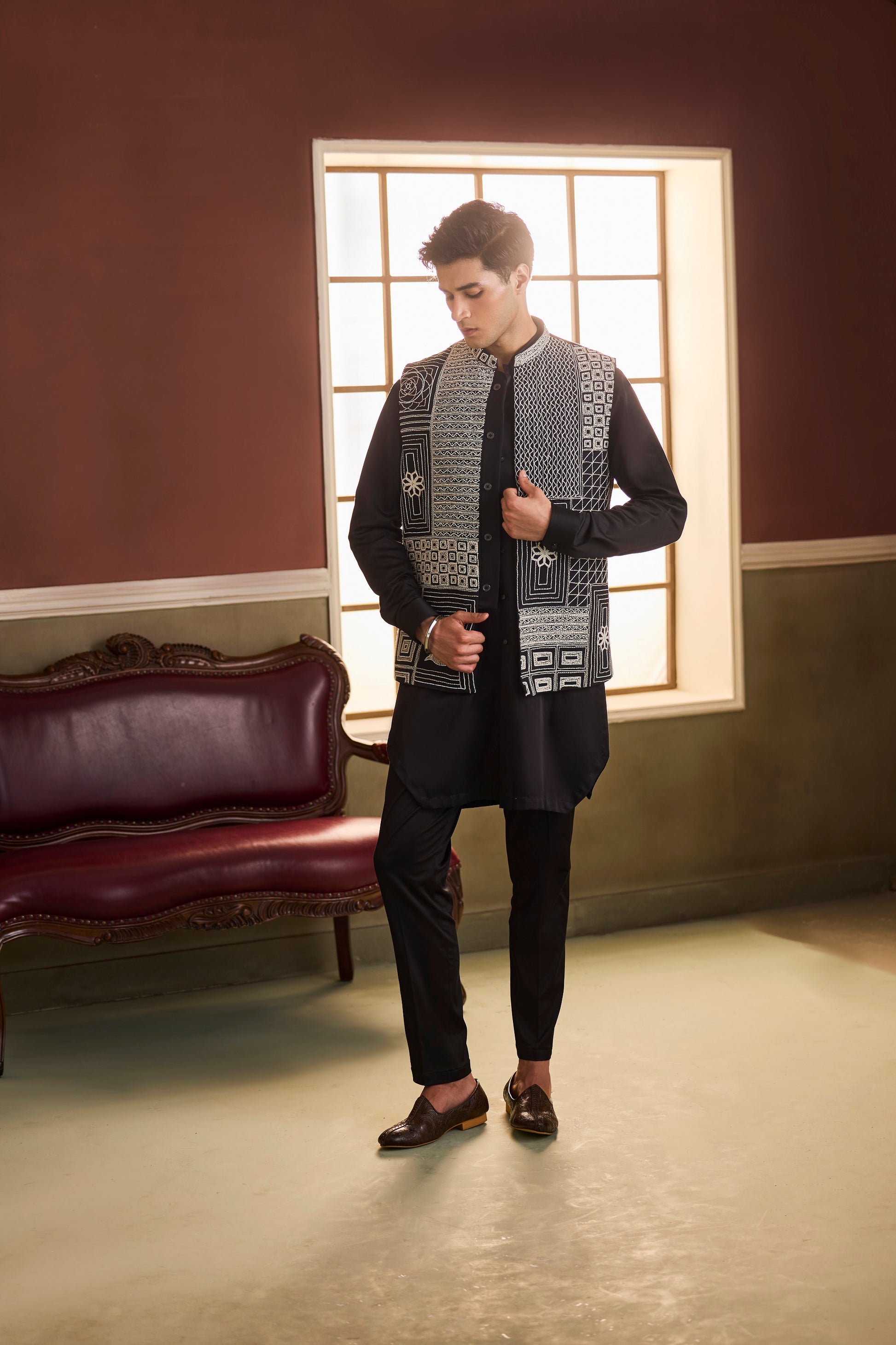 A striking black silk bundi featuring ivory geometric panels meticulously hand-embroidered in resham thread. Layered over a black kurta set, it’s ideal for mehendi evenings or artsy celebrations.
