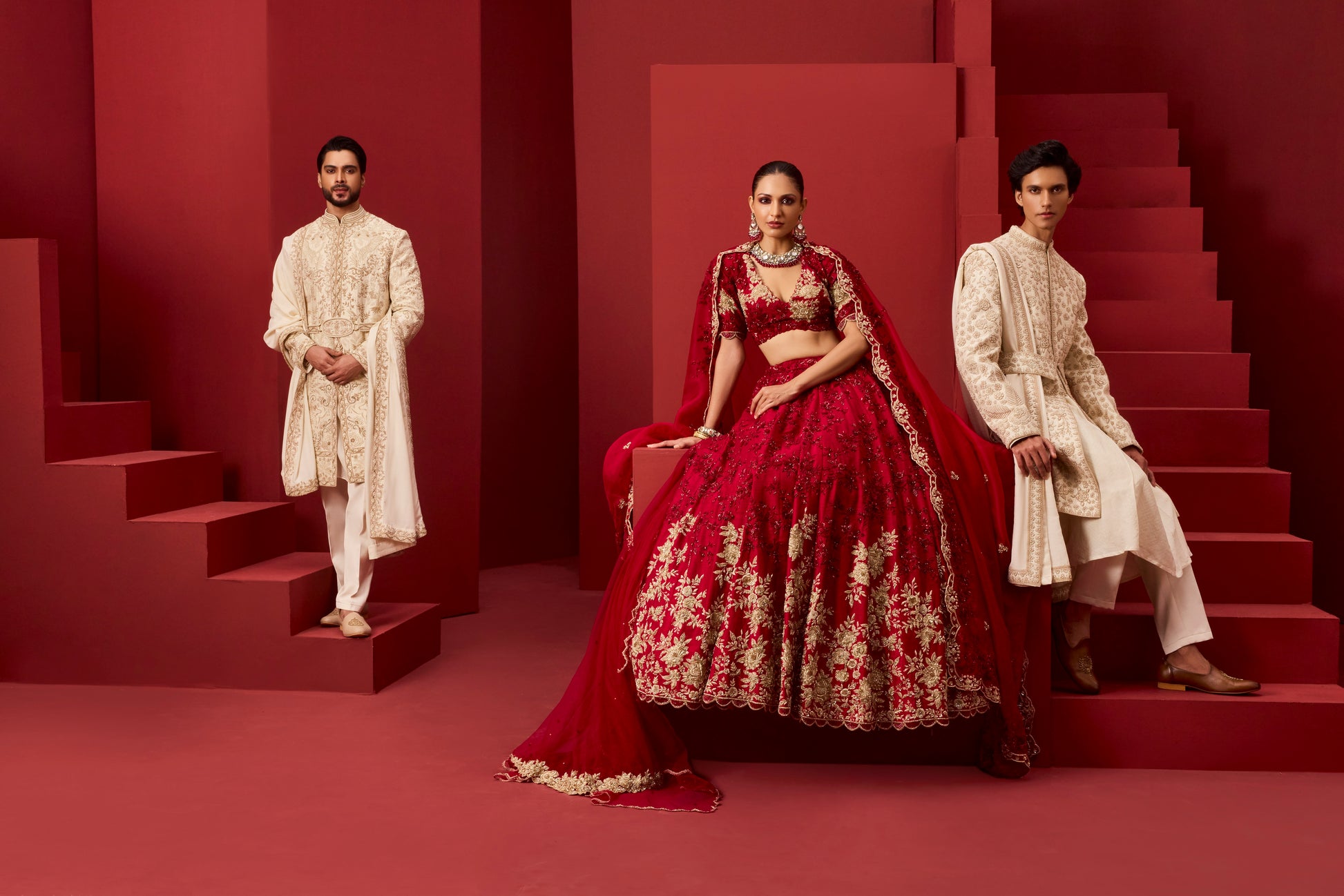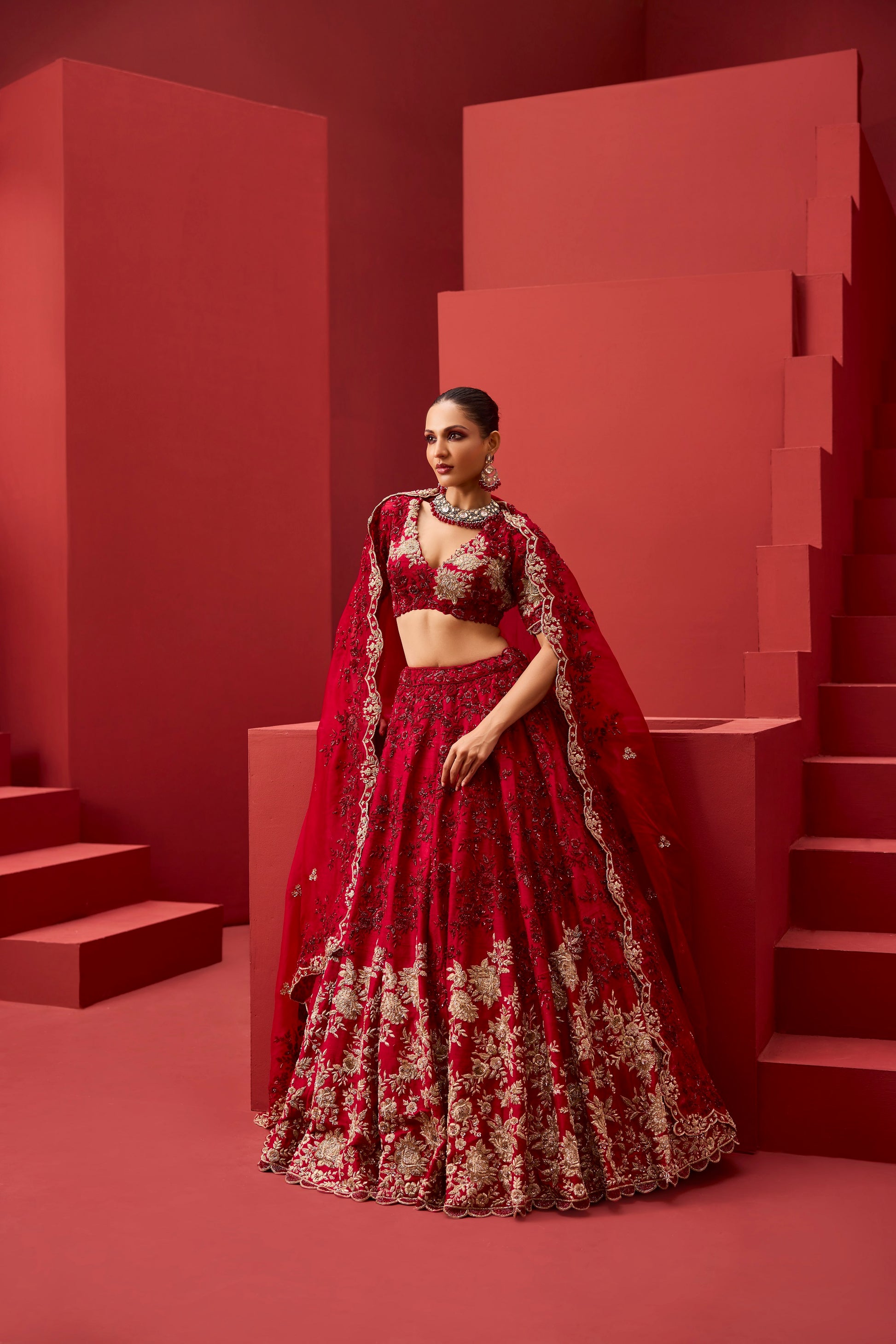 A sheer red veil-style dupatta, delicately embellished, completes the ensemble—softening the silhouette while amplifying its bridal allure.