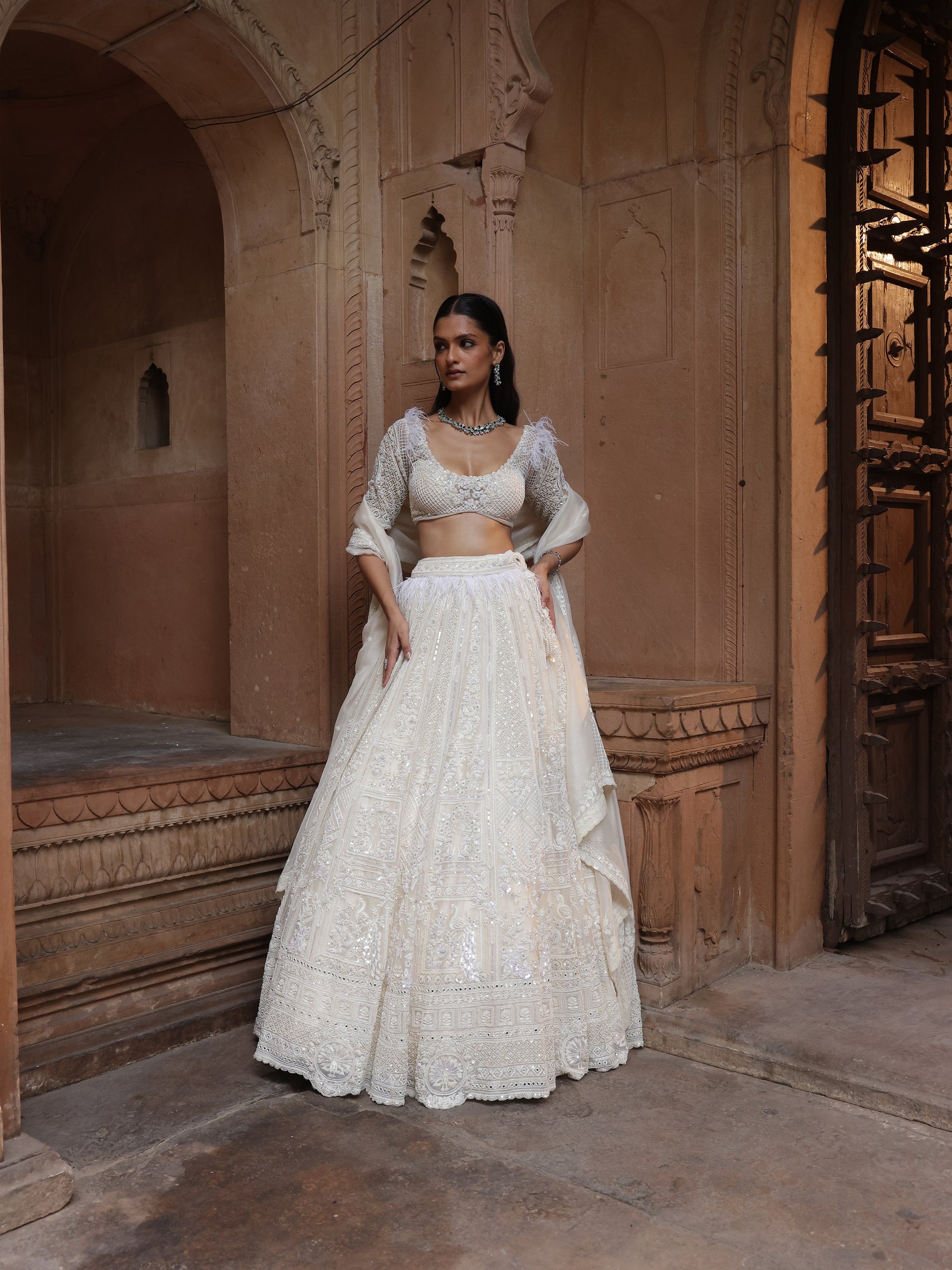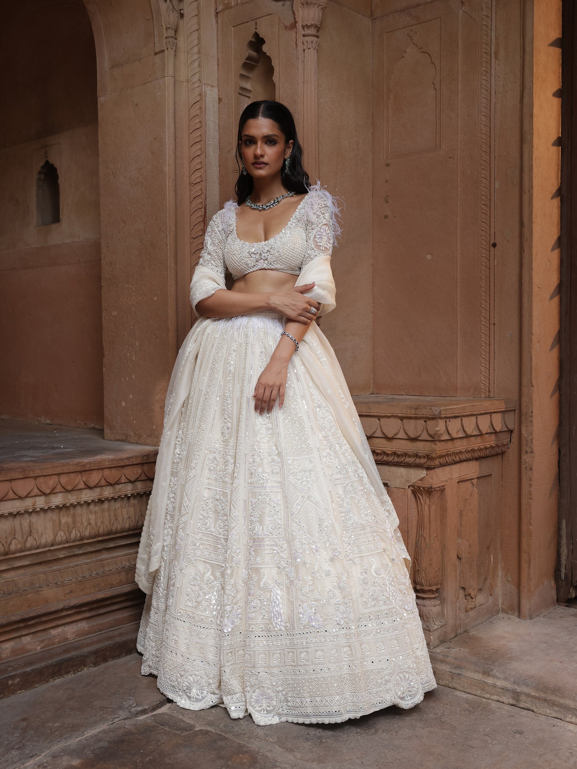 The blouse is finely detailed, complementing the grandeur of the lehenga without overpowering it. Paired with a minimal dupatta, Iris Peacock reflects couture purity—timeless, poised, and impeccably crafted.