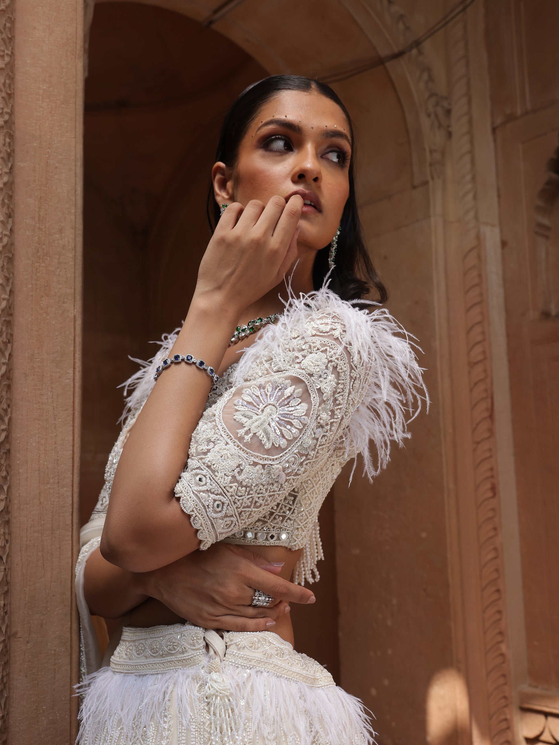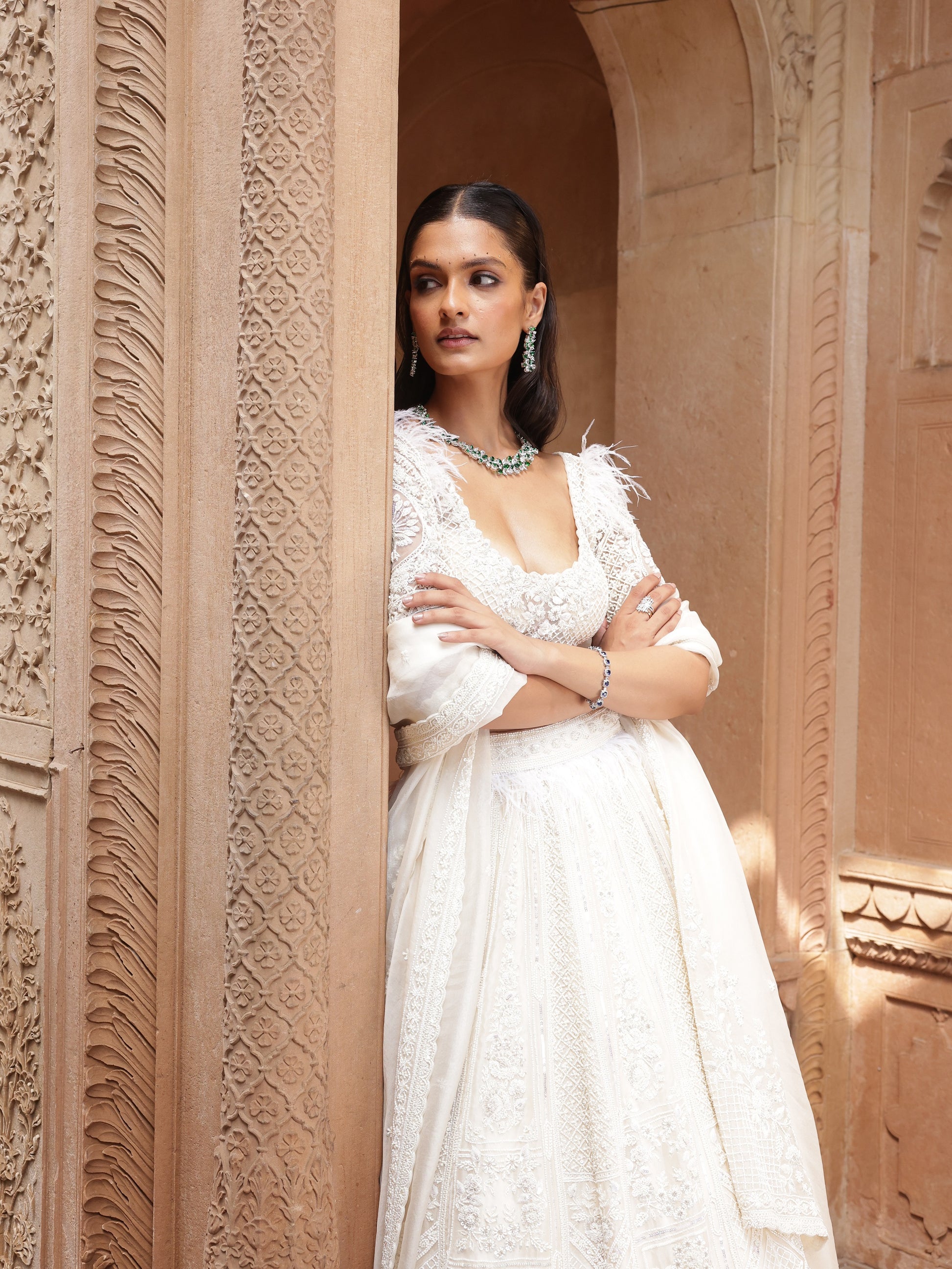 A masterpiece in monochrome, Iris Peacock is sculpted in ivory silk, elevated with precise geometric embroidery, tonal zari work, and subtle bead accents. The skirt is structured yet fluid, offering a sense of architectural elegance.