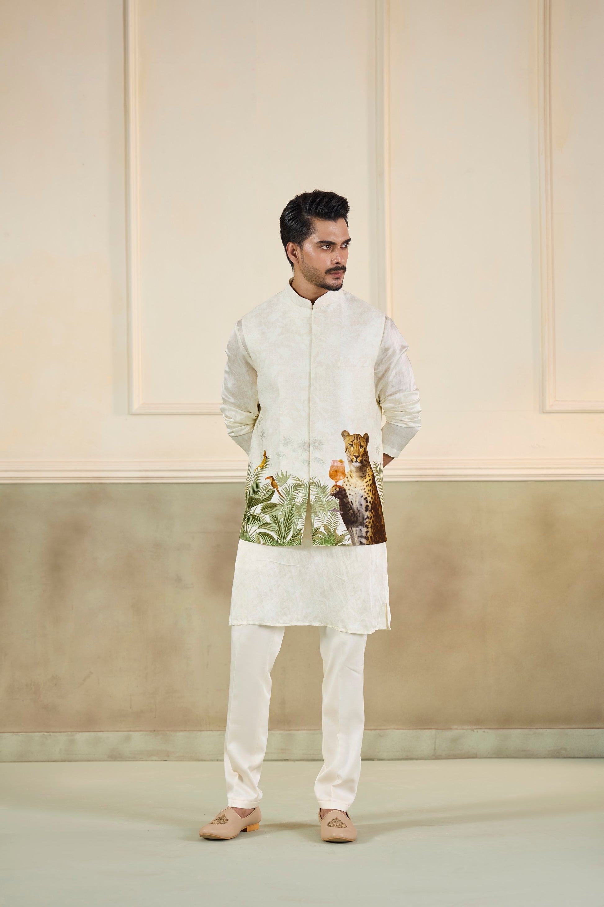 An ivory silk kurta with quirky printed Bundi, accented by a striking jungle motif along the hem. The lifelike leopard and lush foliage lend an artful, contemporary twist to a classic silhouette—ideal for a daytime wedding or mehendi brunch.