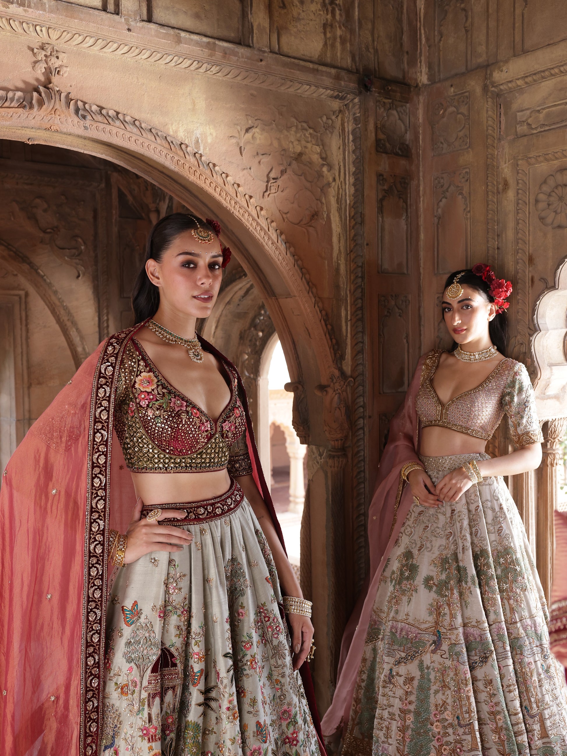 - Fabric : Lehenga- Raw Silk Blouse- Velvet Dupatta- Organza Veil- Net