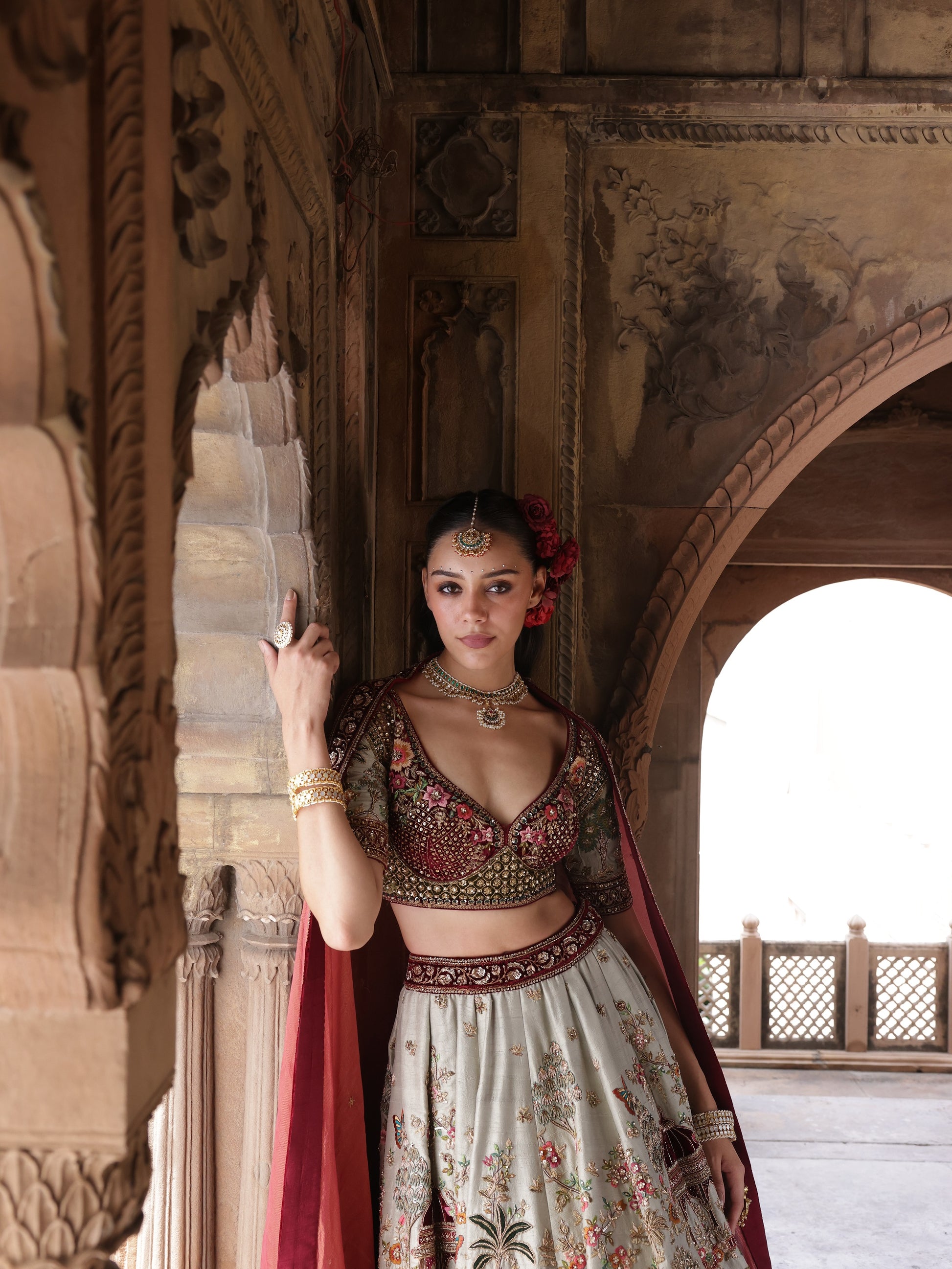 Rooted in regal heritage, Kainat features a soft ivory silk base adorned with lush botanical embroidery, architectural motifs, and traditional borders rendered in resham and zari. The skirt tells a layered story—florals, palms, and palace-inspired imagery unfolding with every step.