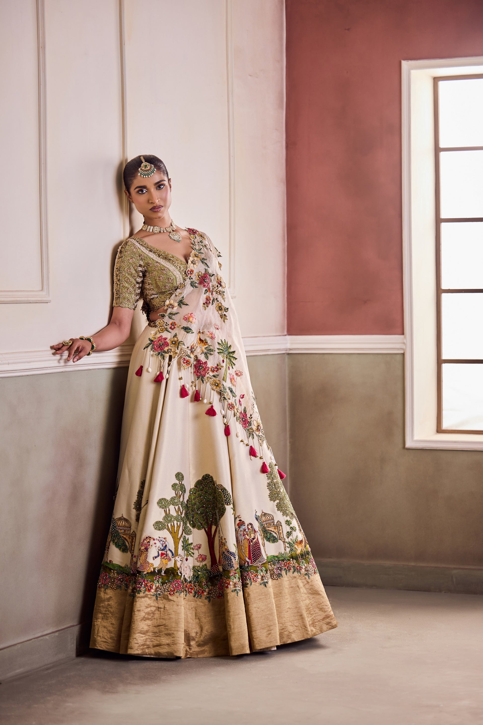 Drawing from the eternal tales of divine love, Vaaha’s Ras-Leela lehenga narrates a story of devotion through exquisite hand embroidery. Scenes of royal gardens, dancers, and elephants come alive in fine resham and zardozi, while the deep olive blouse lends richness to the ivory canvas. Finished with tasselled detailing, it’s a celebration of Indian craftsmanship and spiritual artistry.