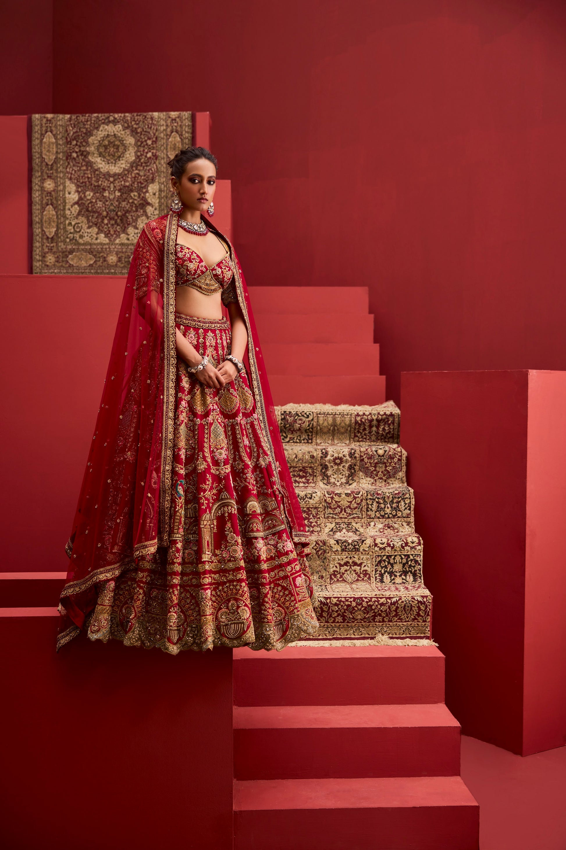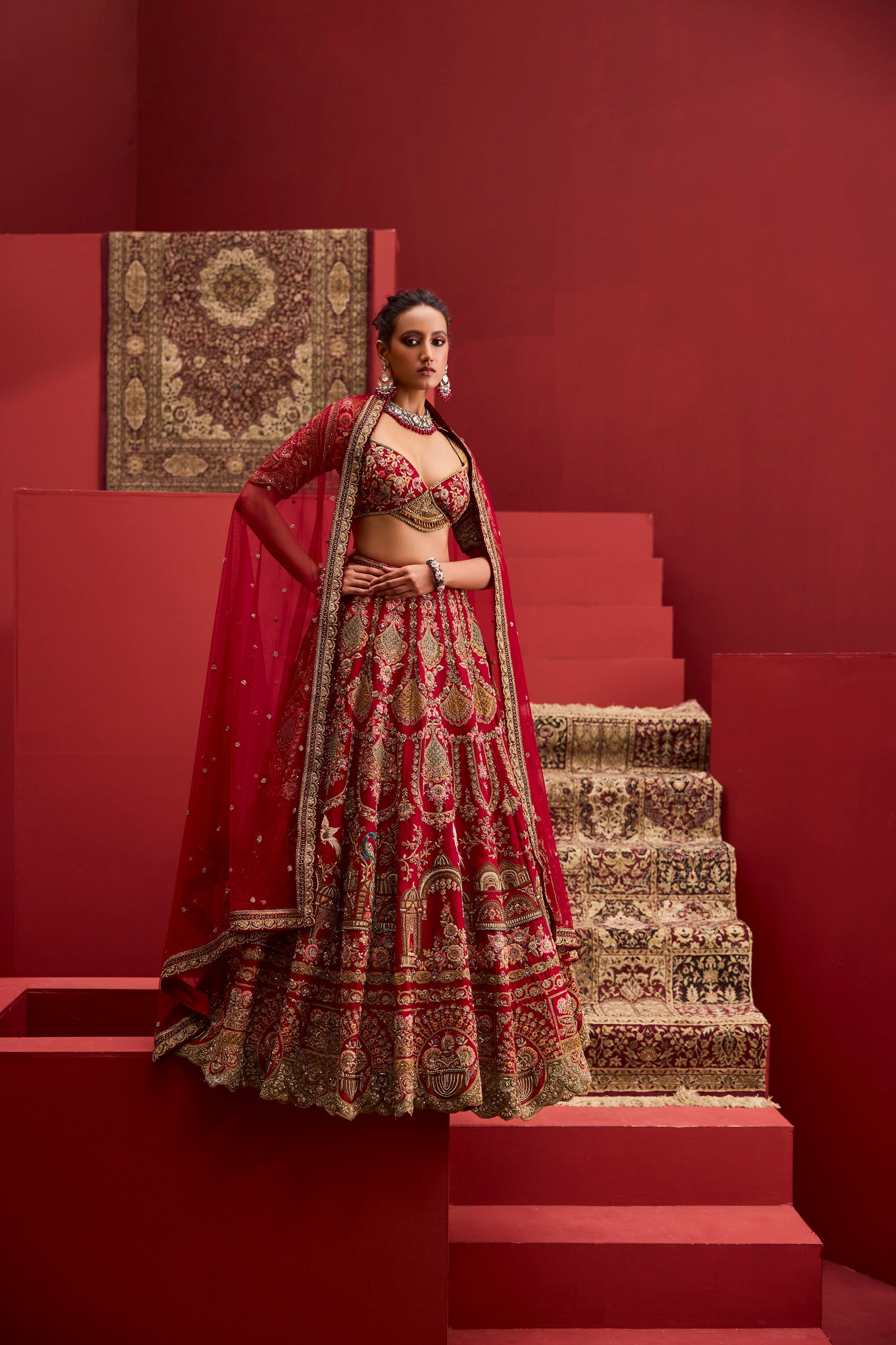 A richly embellished blouse anchors the ensemble, while a deep rust-red dupatta with intricate borders adds warmth and regal contrast.