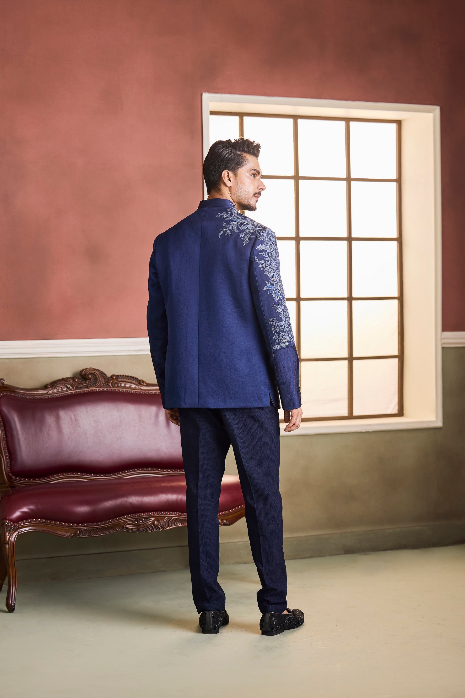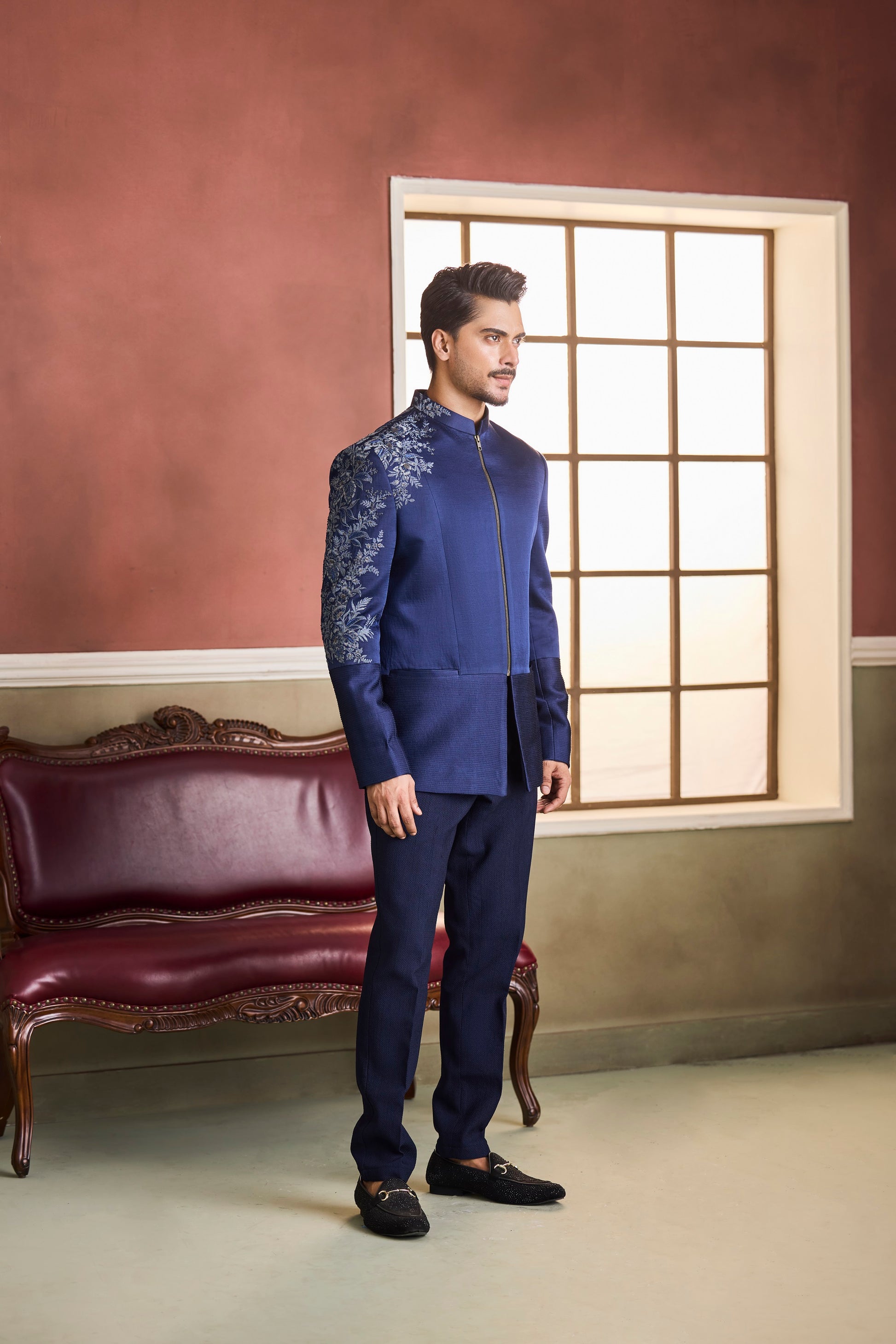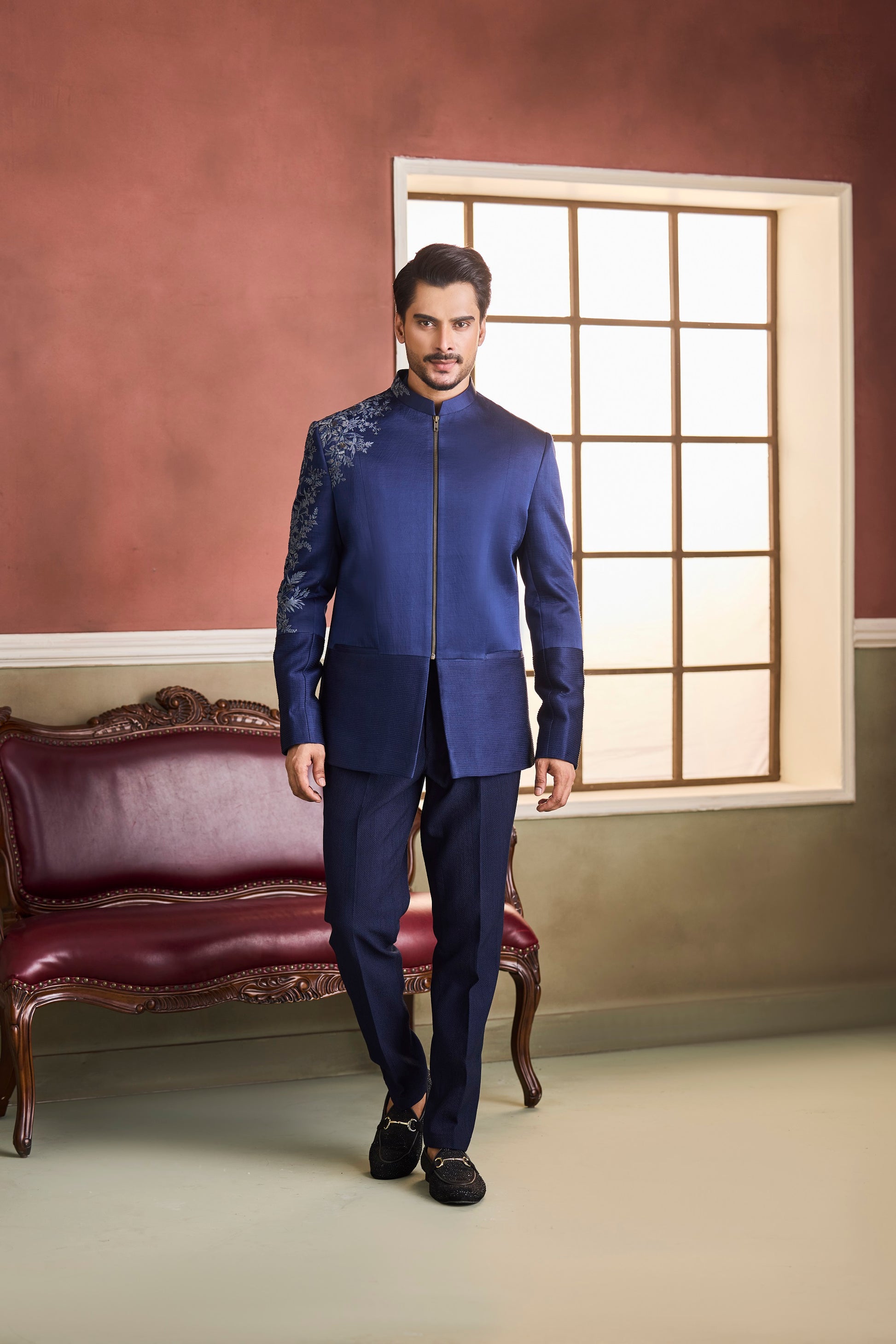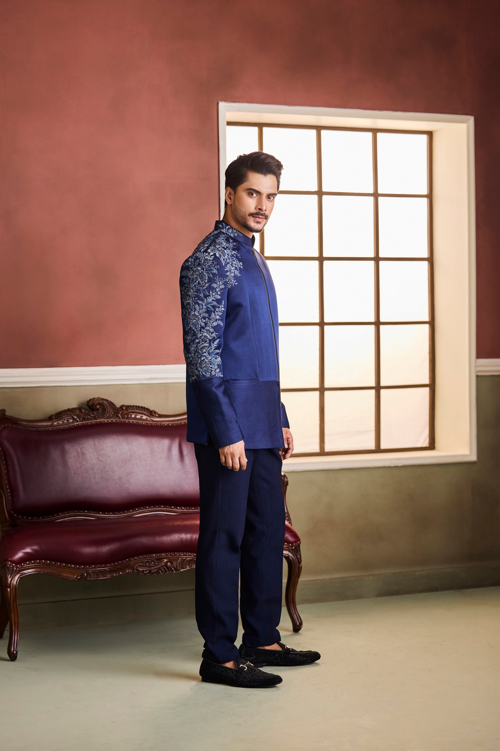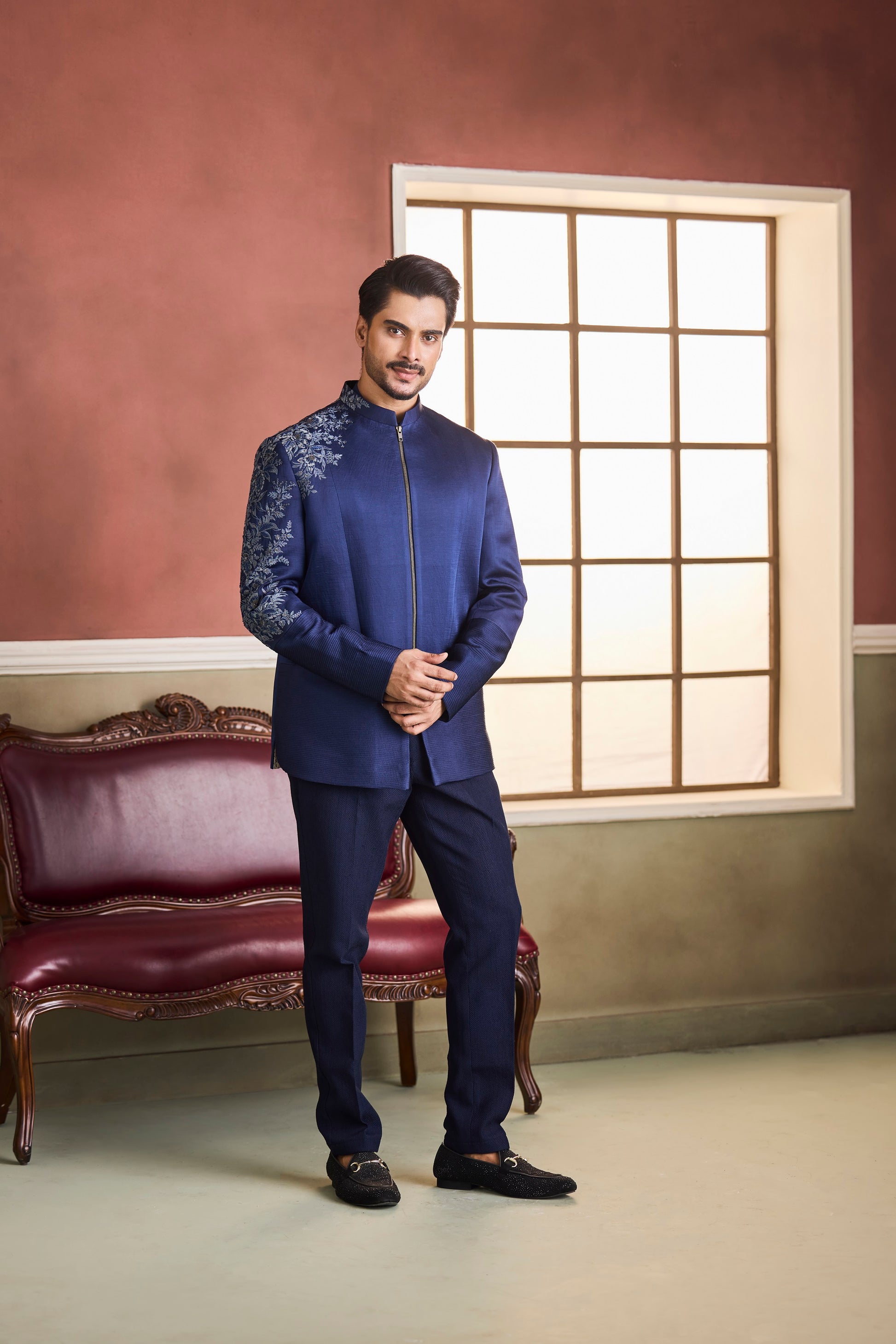 Contemporary navy bandh gala jacket in lustrous raw-silk, finished with a brass zip and contrast textured lower panels. Delicate navy-on-navy floral embroidery runs from shoulder to sleeve for quiet luxury. Lined in breathable cotton-silk — perfect for weddings and reception nights.