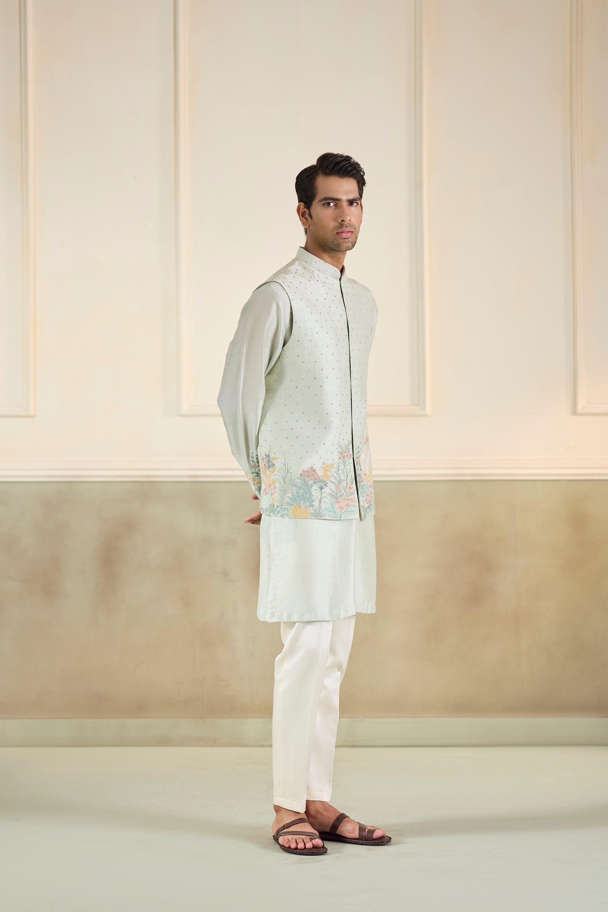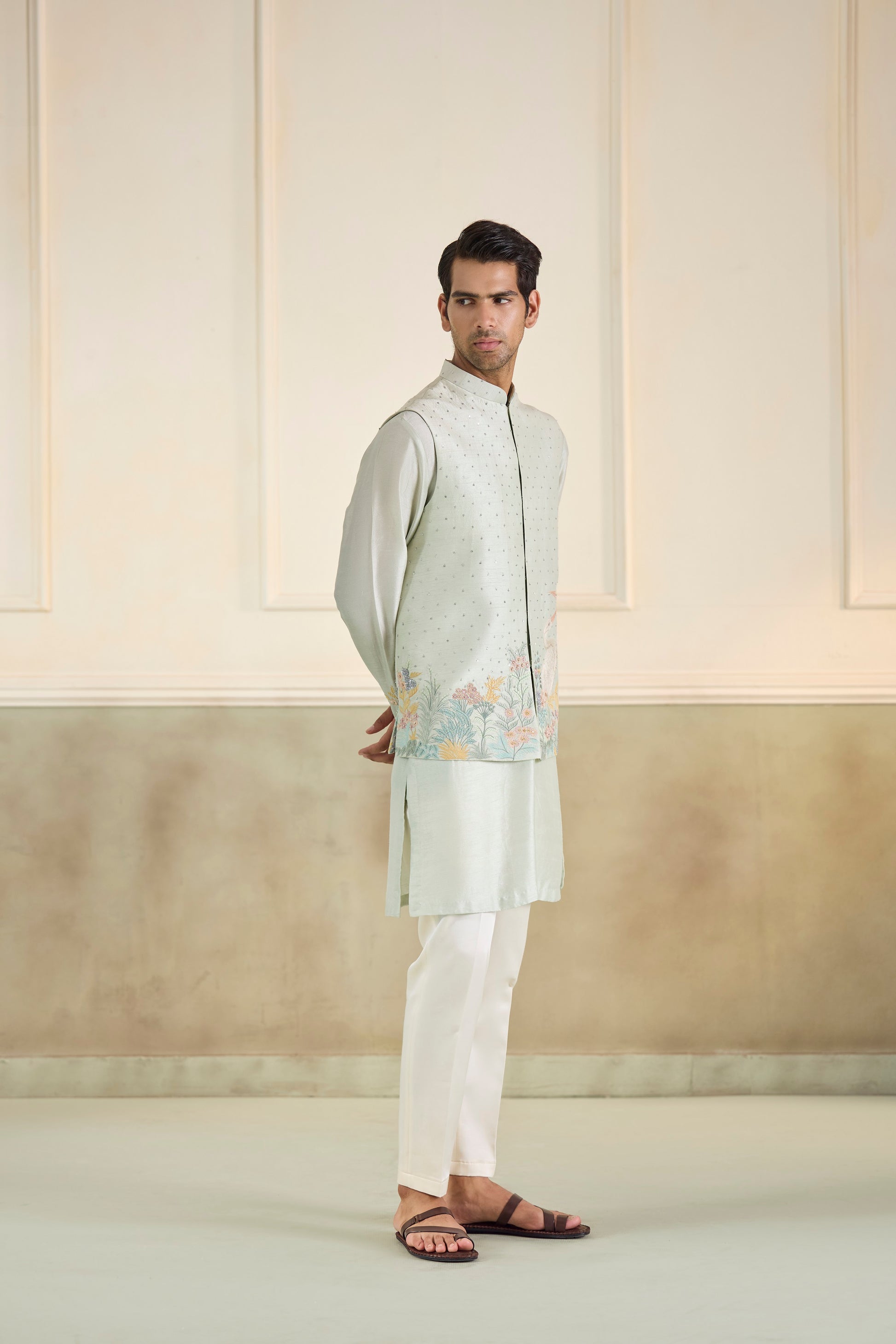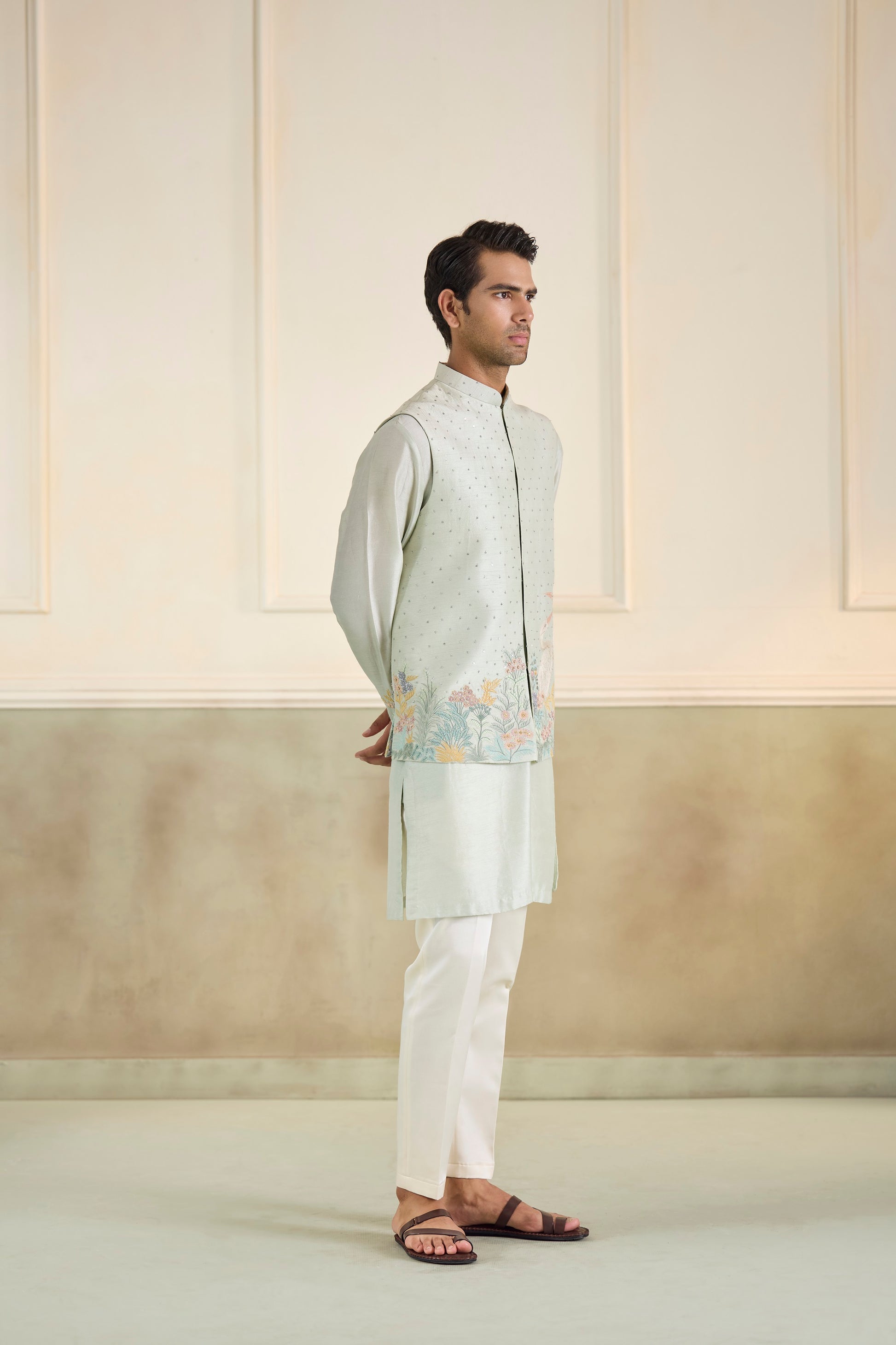 An ethereal mint-green silk kurta set anchors this bundi jacket, peppered with subtle sequin pin-dots and edged with hand-embroidered meadow blooms in blush, buttercup, and lilac. Ideal for daytime pheras or a summer soiree.