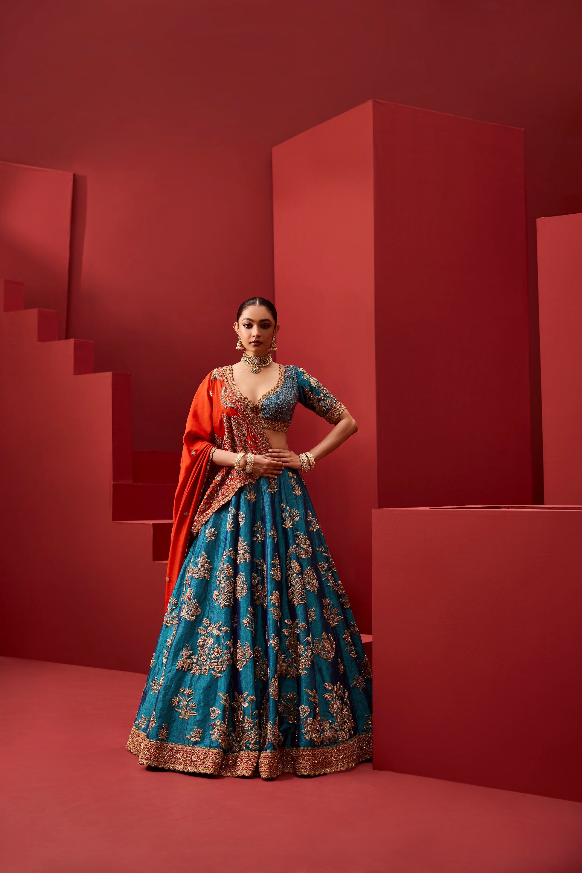 A bold dialogue of colour and craft, this lehenga is rendered in deep teal silk, lavishly embroidered with antique gold zari, resham florals, and heritage foliage motifs. The skirt flows with sculptural volume, grounded by an intricately worked border that lends ceremonial gravitas.