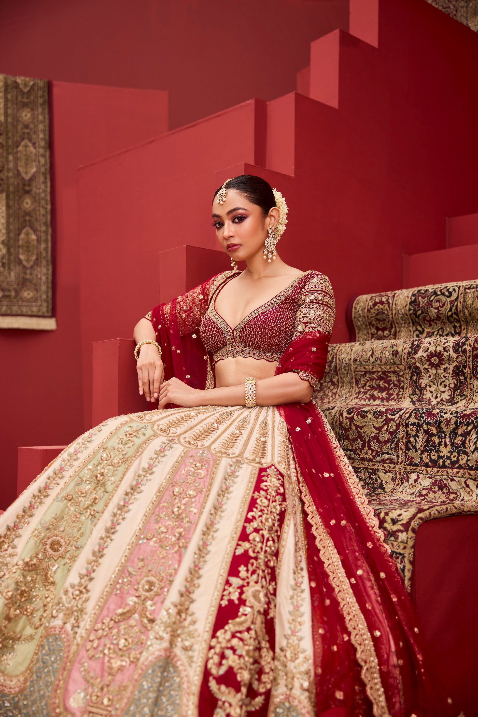 A celebration of nuanced craftsmanship, this lehenga is rendered in a soft ivory silk base, articulated through ornate vertical panels in deep crimson, muted teal, antique gold, and warm saffron. Each panel is richly embroidered with traditional floral and architectural motifs, creating a rhythm of colour and texture across the skirt.