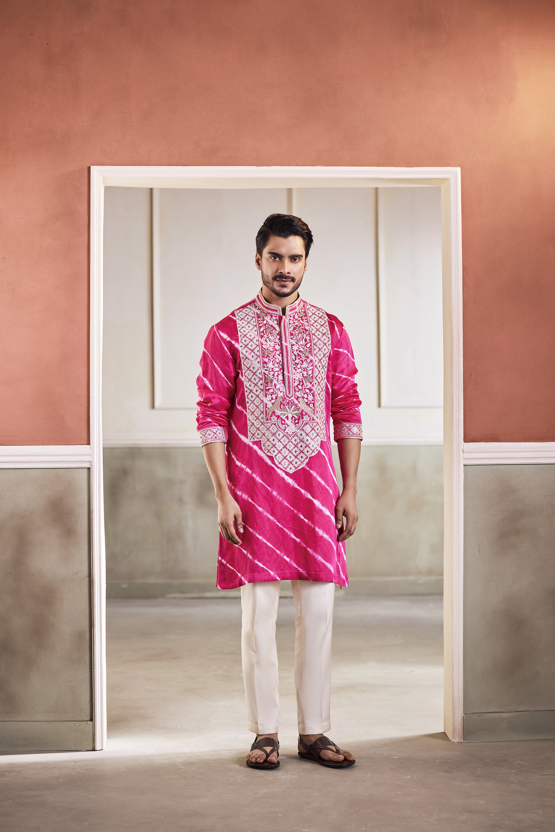 Vibrant rani-pink cotton–silk makes a striking base for this kurta, patterned with diagonal bandhej tie-dye stripes. The heavily embroidered yoke in ivory threadwork features intricate floral vines and geometric jaal, creating a festive focal point. Styled with off-white slim pants, it is perfect for sangeet nights or haldi-mehandi celebrations.