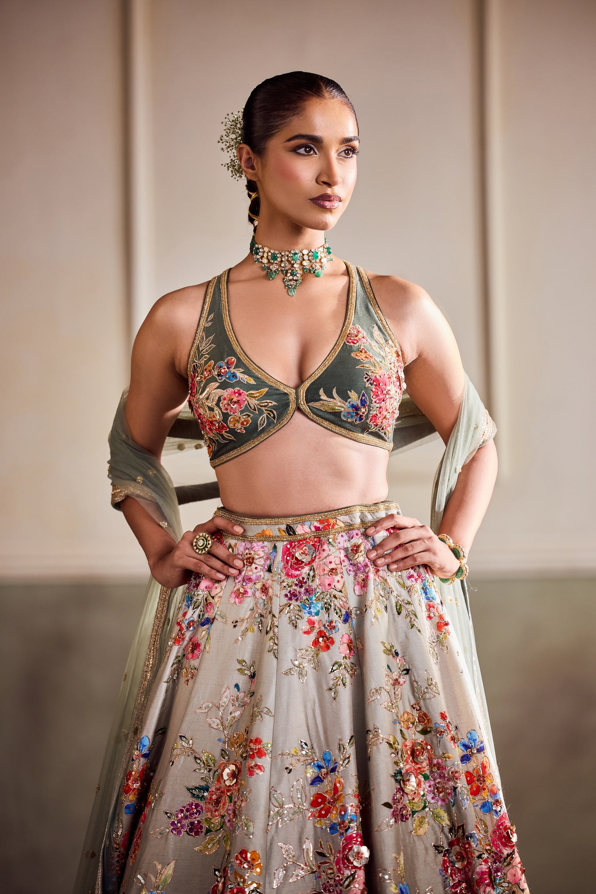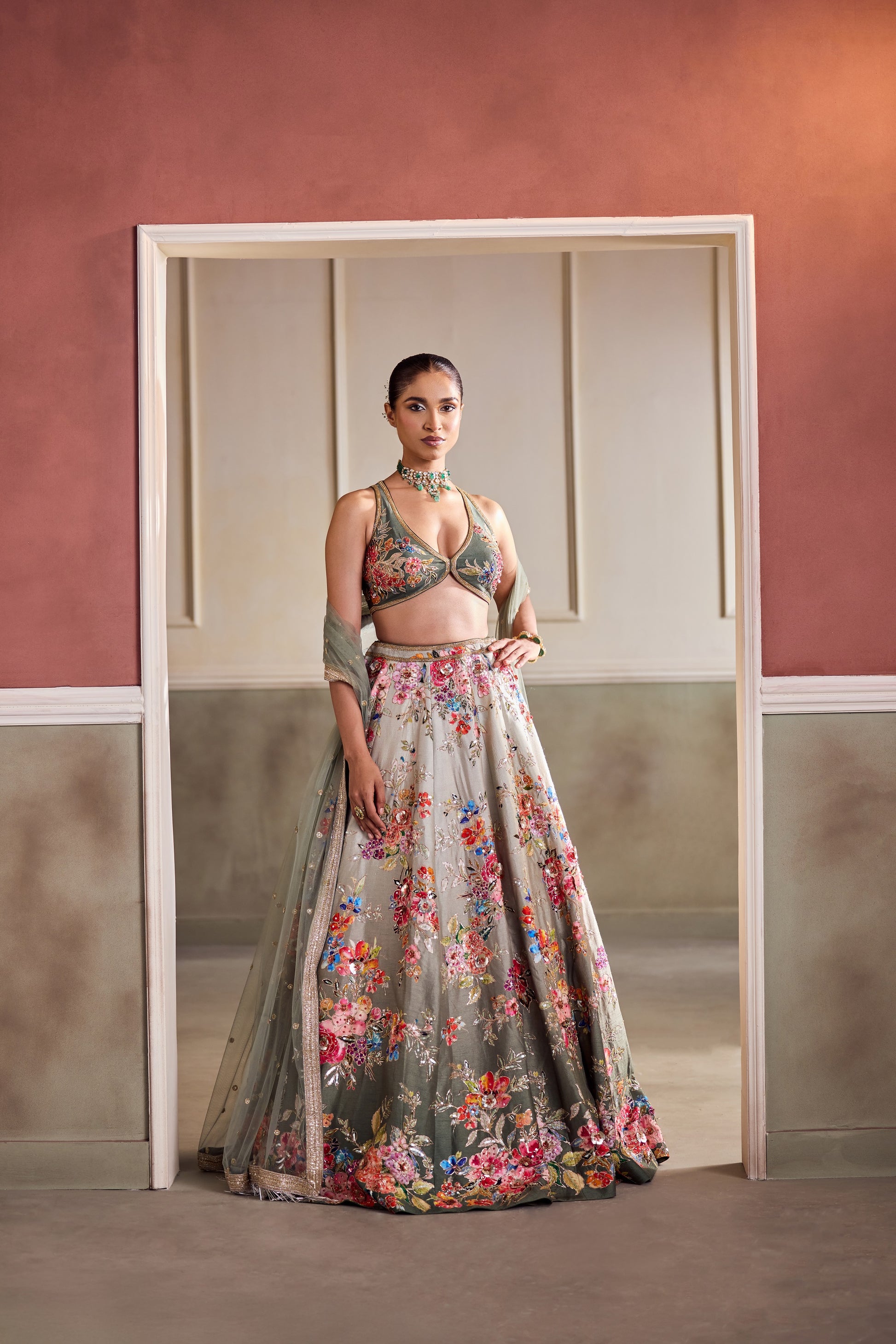 In hues of sage and rose, this ethereal creation from Vaaha evokes the romance of twilight gardens. The tulle base, hand-embroidered with vivid florals, shimmers with sequin-dusted finesse. The sculpted blouse and gossamer dupatta frame the look in quiet allure, making it perfect for a modern muse rooted in heritage.