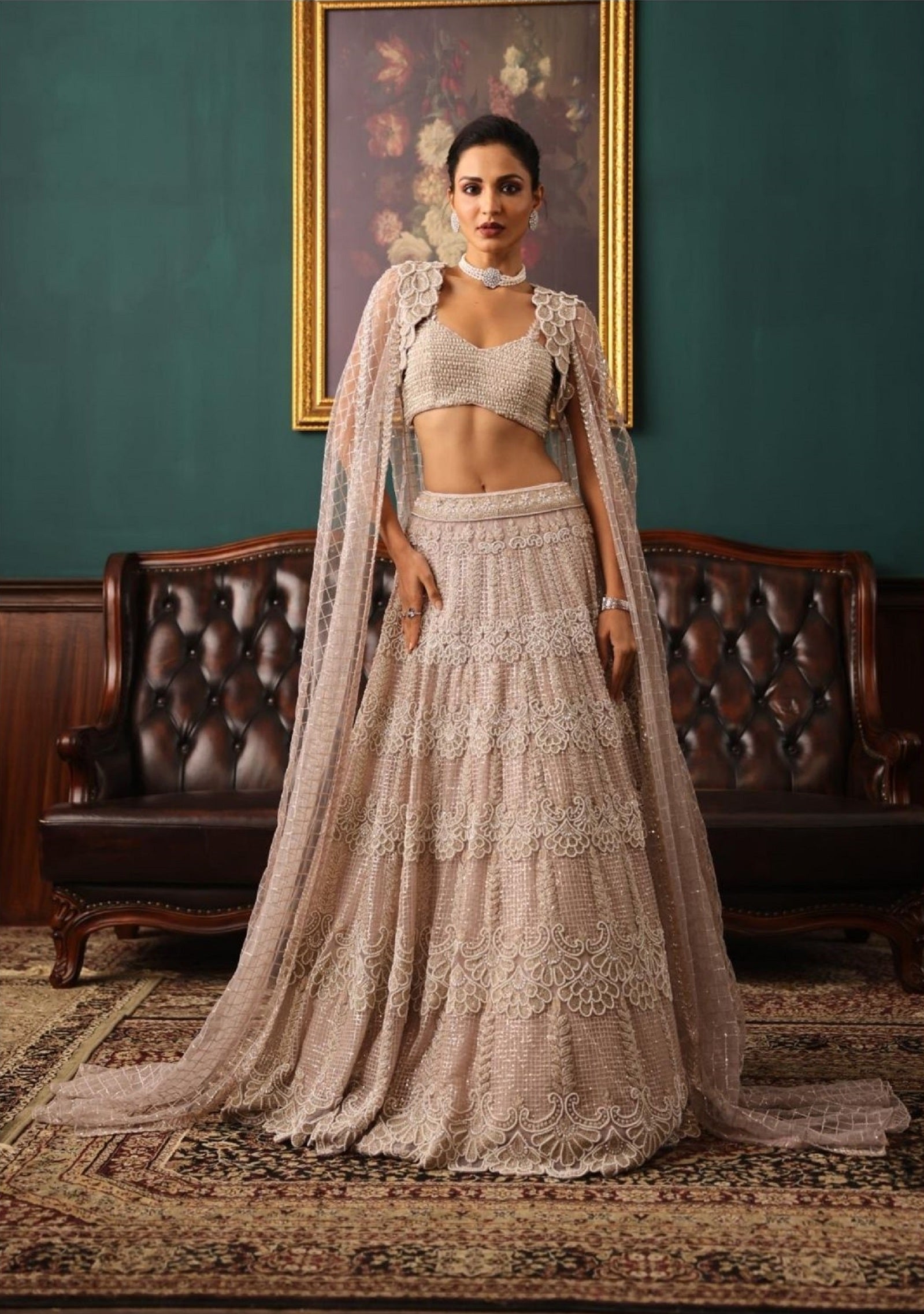 this lehenga set is rendered in a soft pearl tone, brought to life through meticulously layered embroidery. The skirt features scalloped lace patterns that move fluidly with the body, while the sculpted blouse offers a contemporary silhouette softened by artisanal detailing.