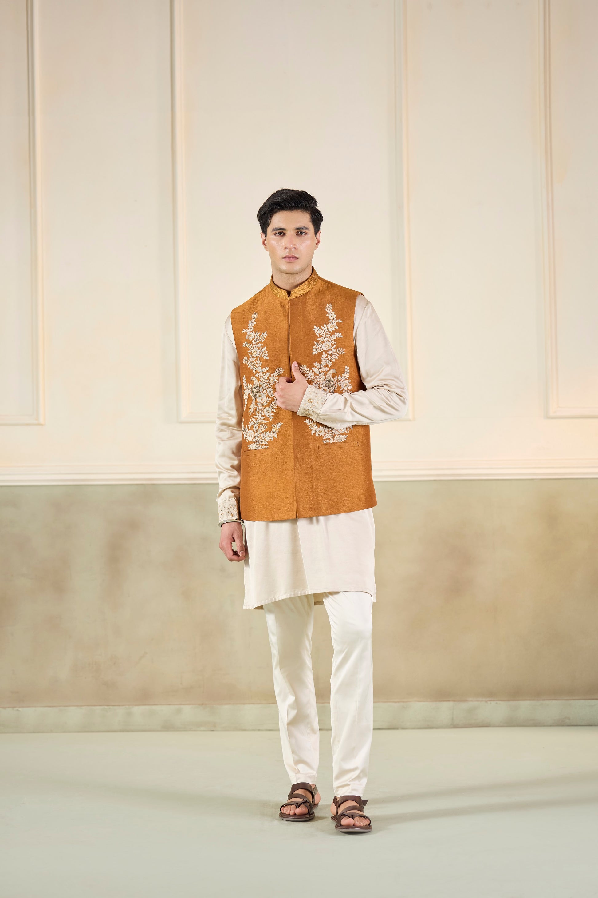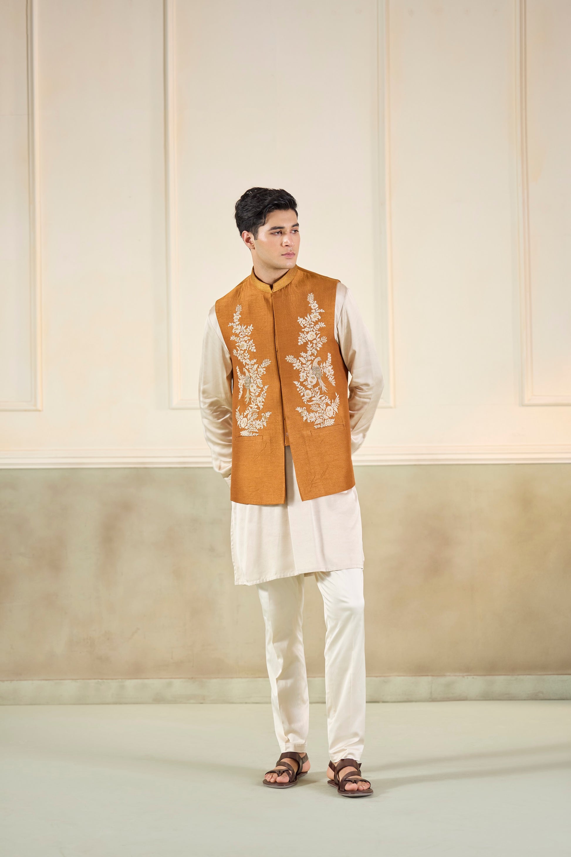 A rich rust-saffron raw silk bundi embroidered with ivory floral vines, worn over an ecru silk kurta and tapered trousers. The earthy palette and intricate detailing make it ideal for sangeet or festive evenings.