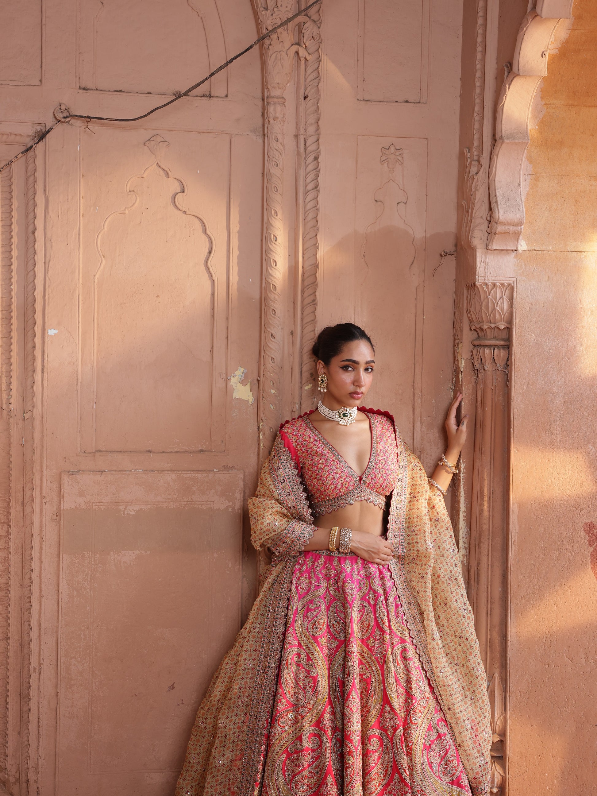 A study in ornate femininity, Sarika is rendered in warm rose and coral tones on a luxurious silk canvas. The lehenga is adorned with intricate paisley and jaal-inspired embroidery, executed in fine resham and metallic accents that shimmer subtly under light.