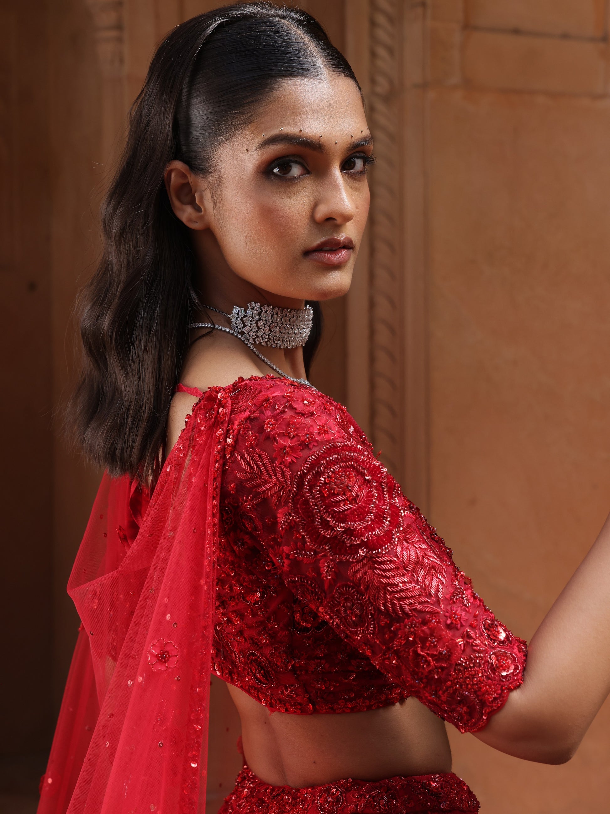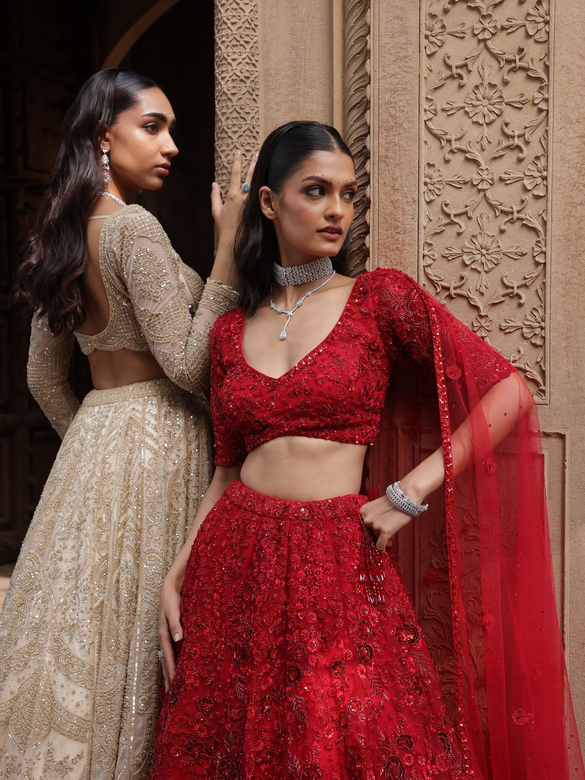 The blouse mirrors the richness with sculpted embroidery, while a sheer red dupatta adds movement and allure. Designed to command attention, Scarlet is a powerful expression of modern ceremonial dressing.