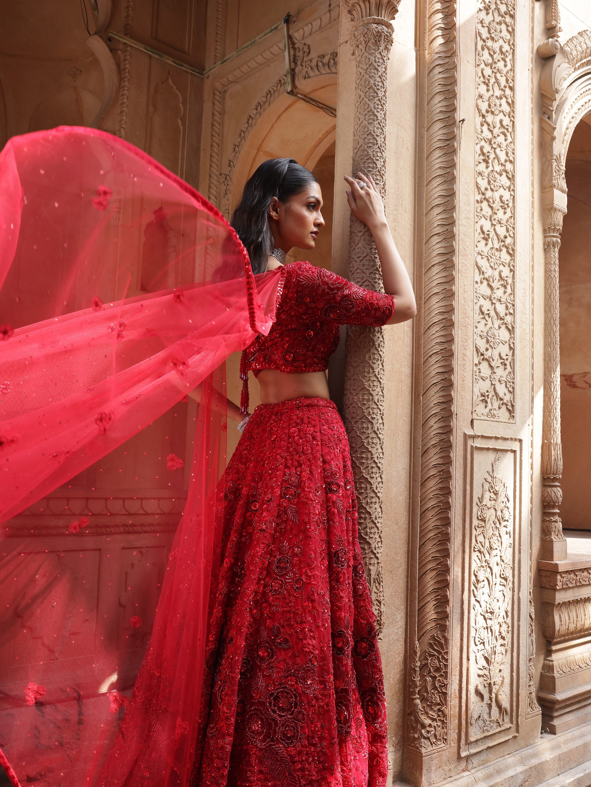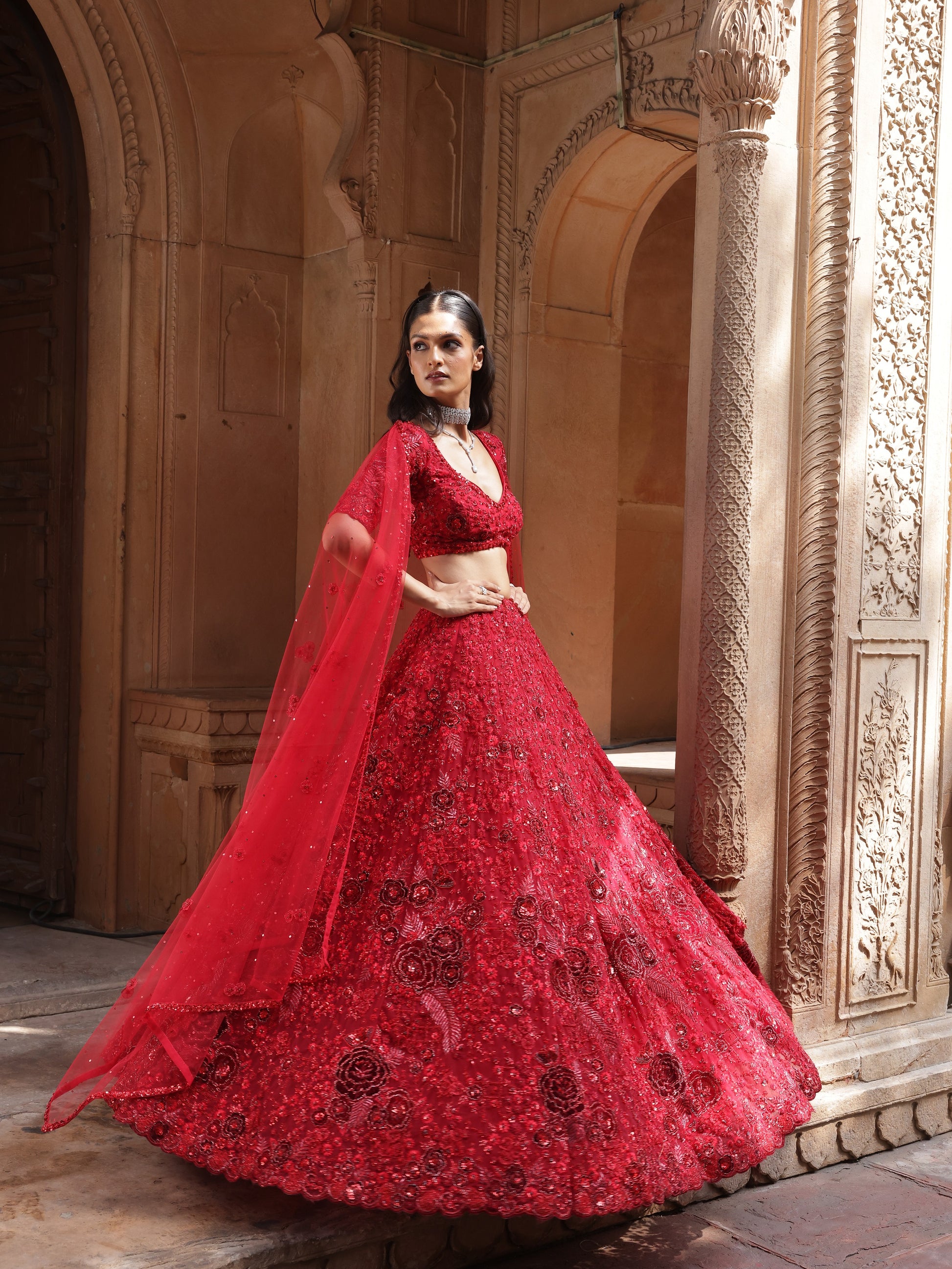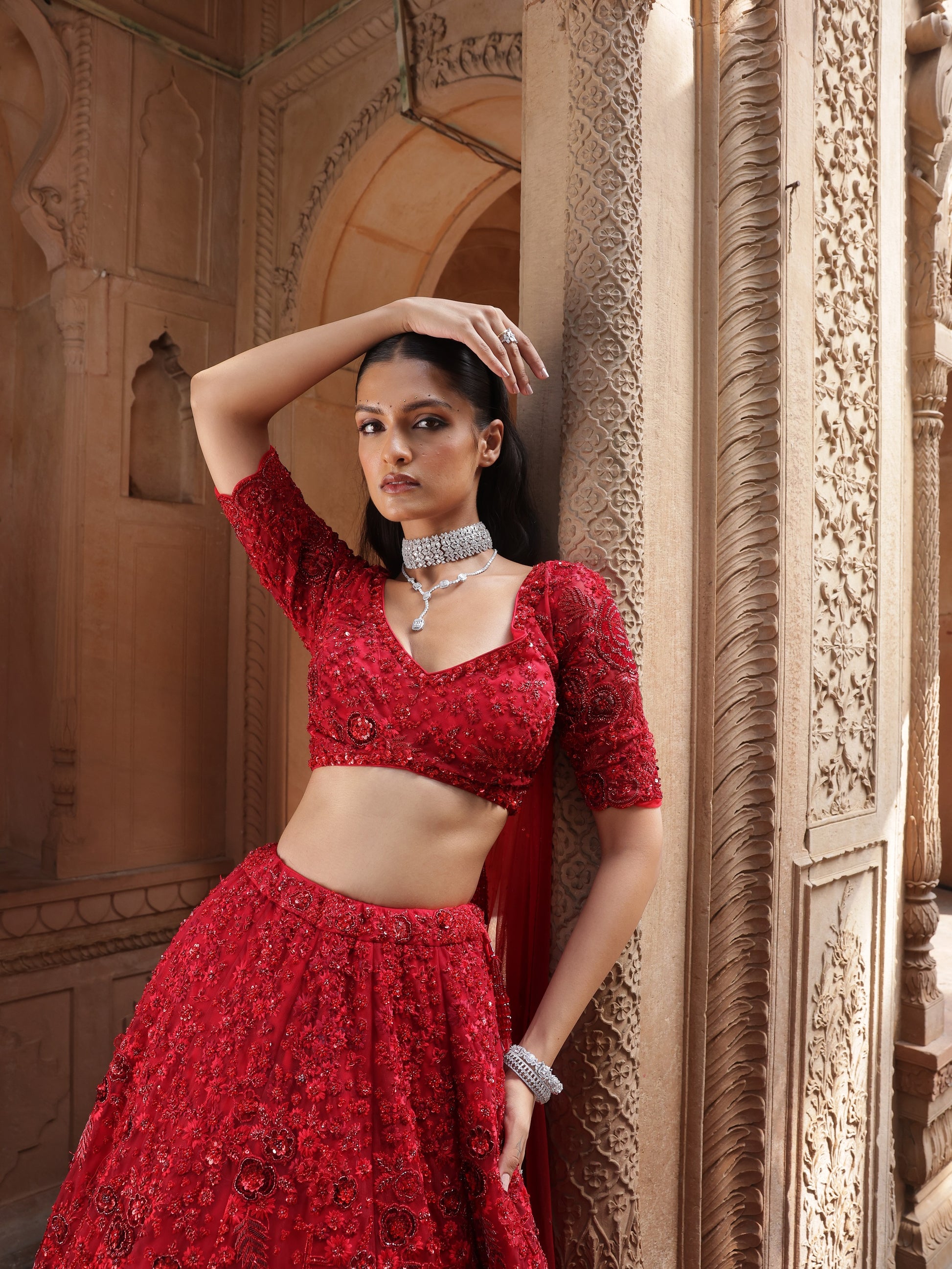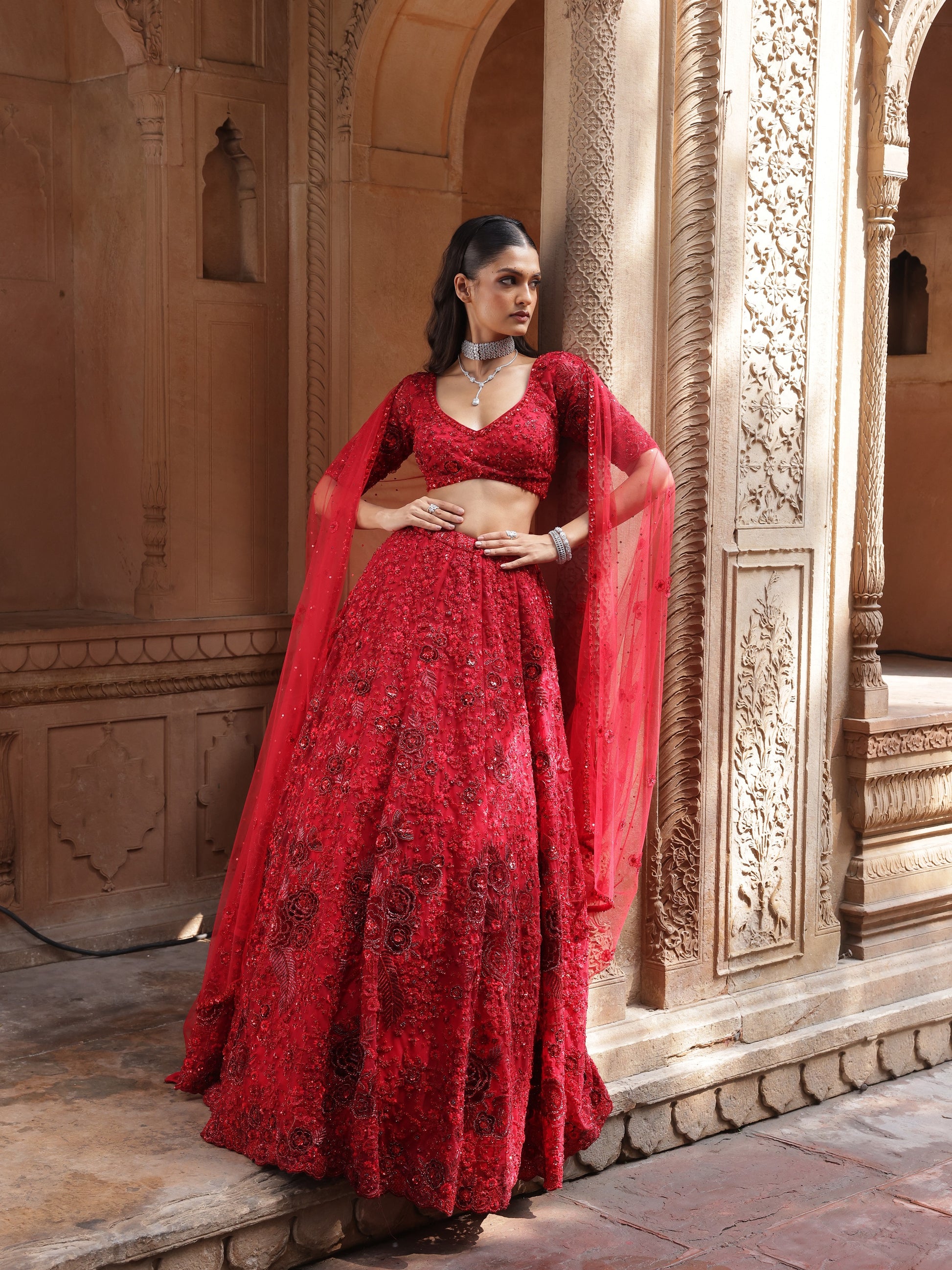 Bold and unapologetic, Scarlet is rendered in a striking deep red silk, saturated with couture drama. The lehenga is intricately hand-embroidered with dense tonal threadwork, dimensional floral motifs, and subtle sequin accents, creating depth and intensity throughout the skirt.