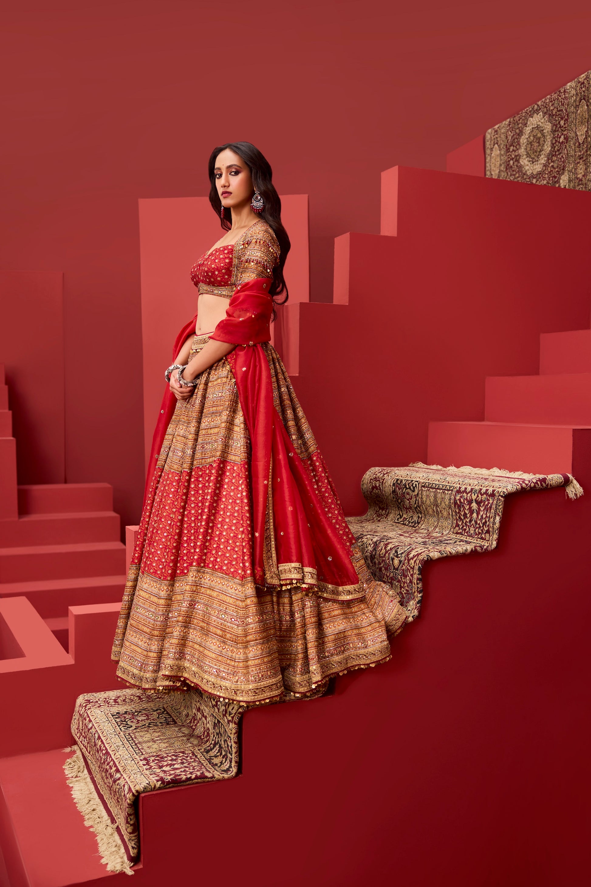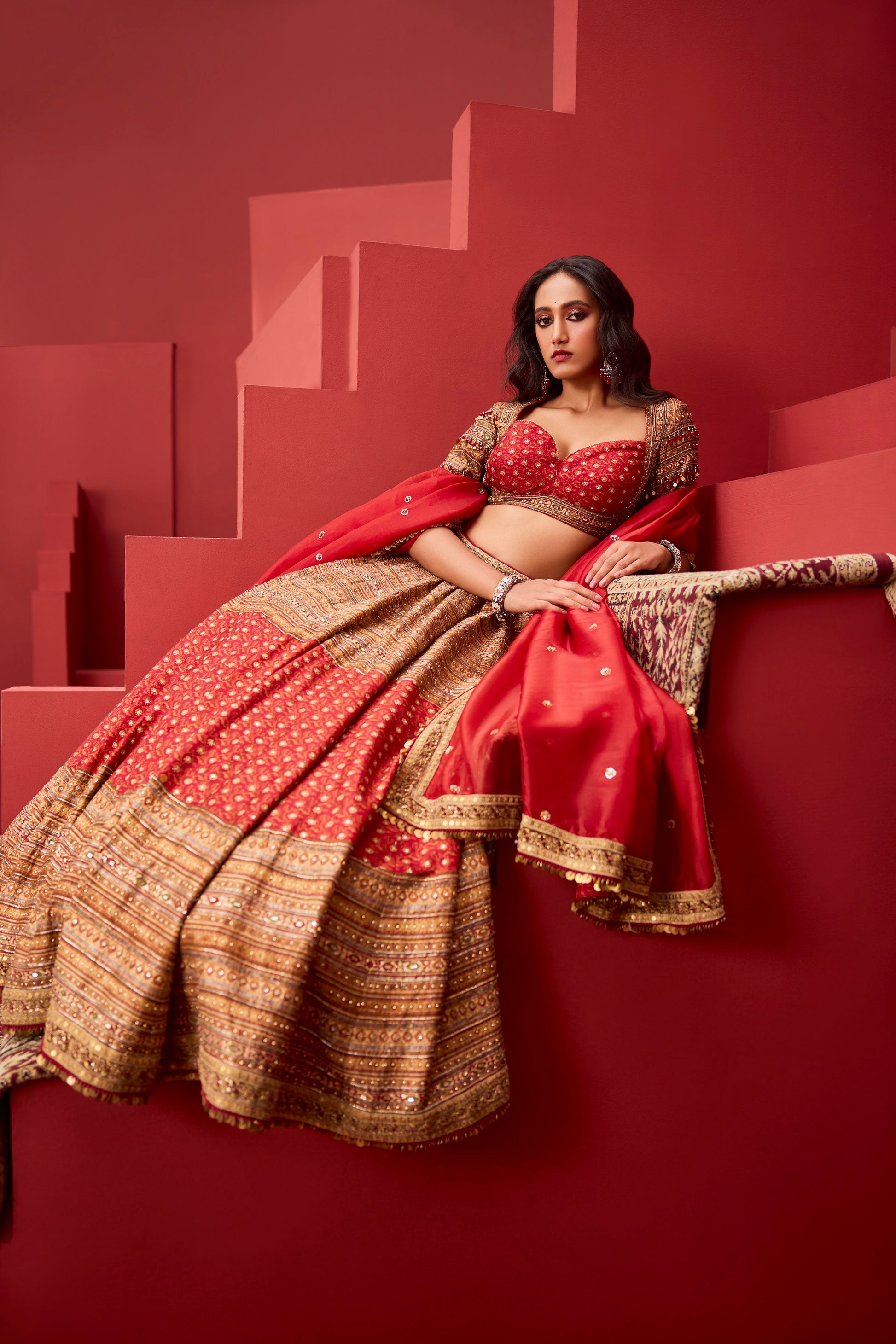 Infused with old-world charm, this sindoor red lehenga is crafted in silk with intricate woven and embroidered motifs inspired by traditional textiles. The skirt showcases layered borders and repetitive floral patterns, while the embroidered blouse balances structure with softness. A matching red dupatta, lightly embellished, flows effortlessly alongside the ensemble. Rich in colour and symbolism, this look honours heritage with enduring grace.