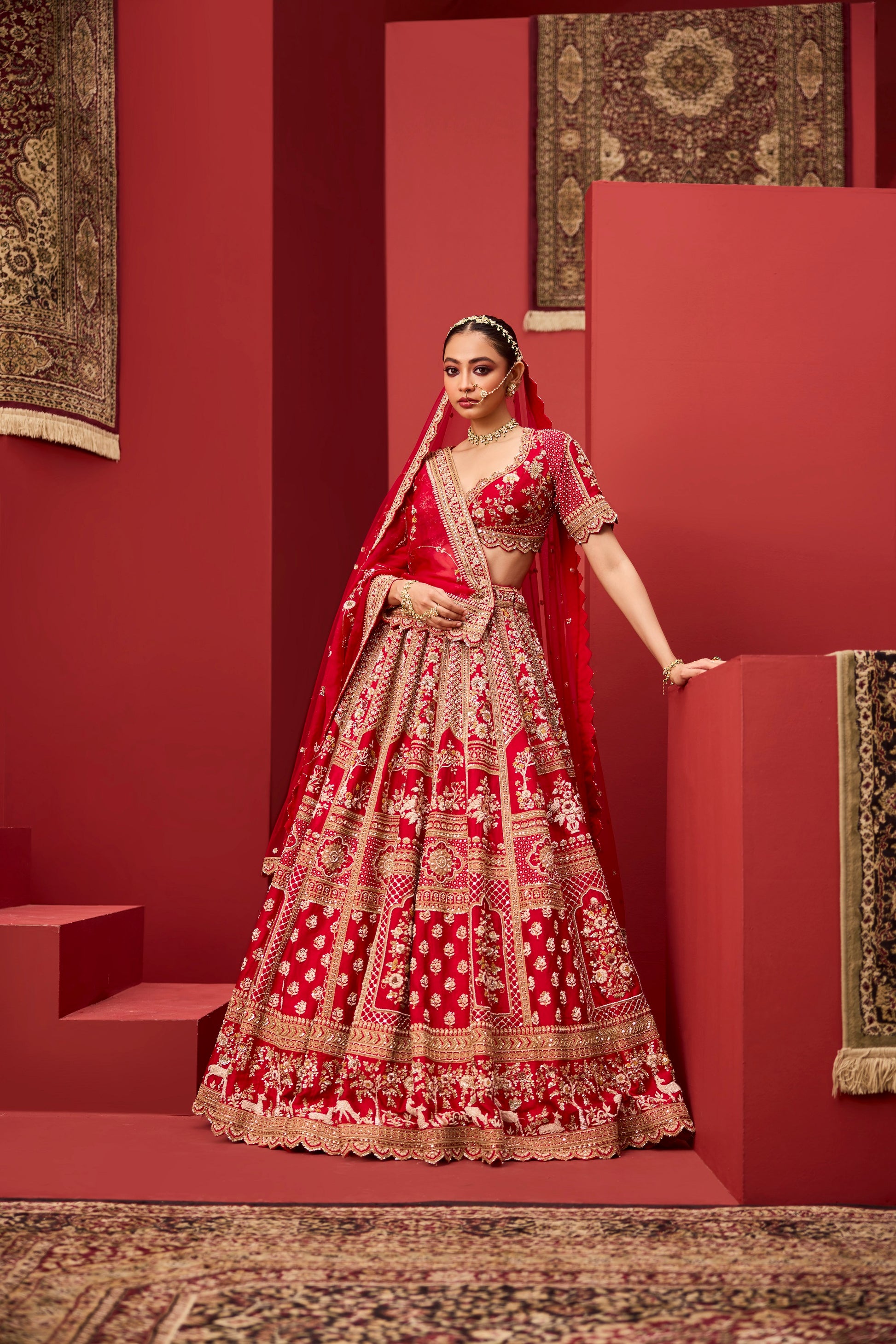 Structured and stately, this lehenga features vertical embroidered panels in rich red silk, detailed with repeating traditional motifs and fine zari work. The design elongates the silhouette while maintaining ceremonial richness through heavily worked borders.