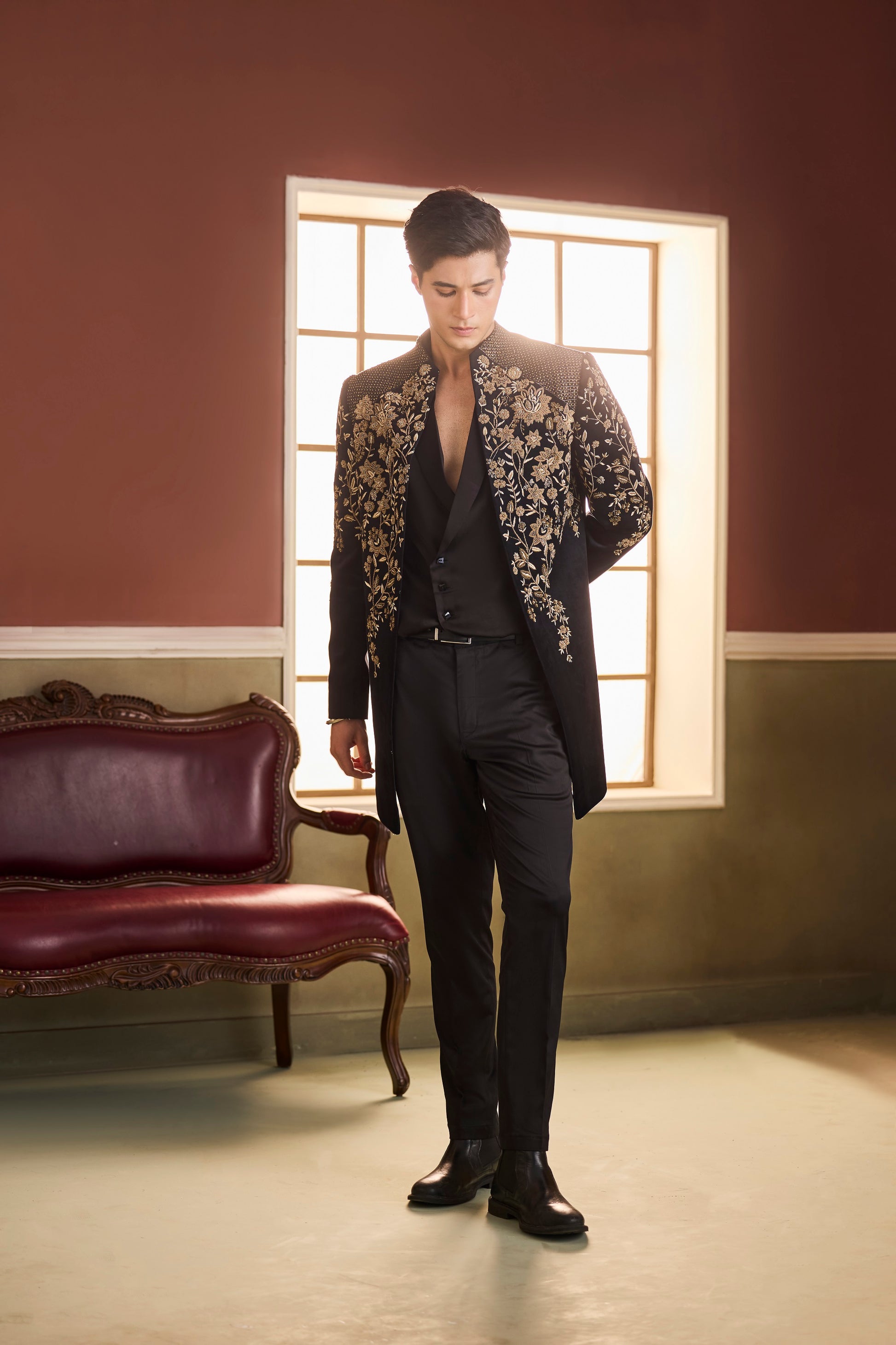 A regal black velvet achkan enriched with dense antique-gold zardozi and sequin work in an intricate floral jaal. Worn over a tonal waistcoat and trousers, it’s a show-stopping choice for sangeet or reception nights.